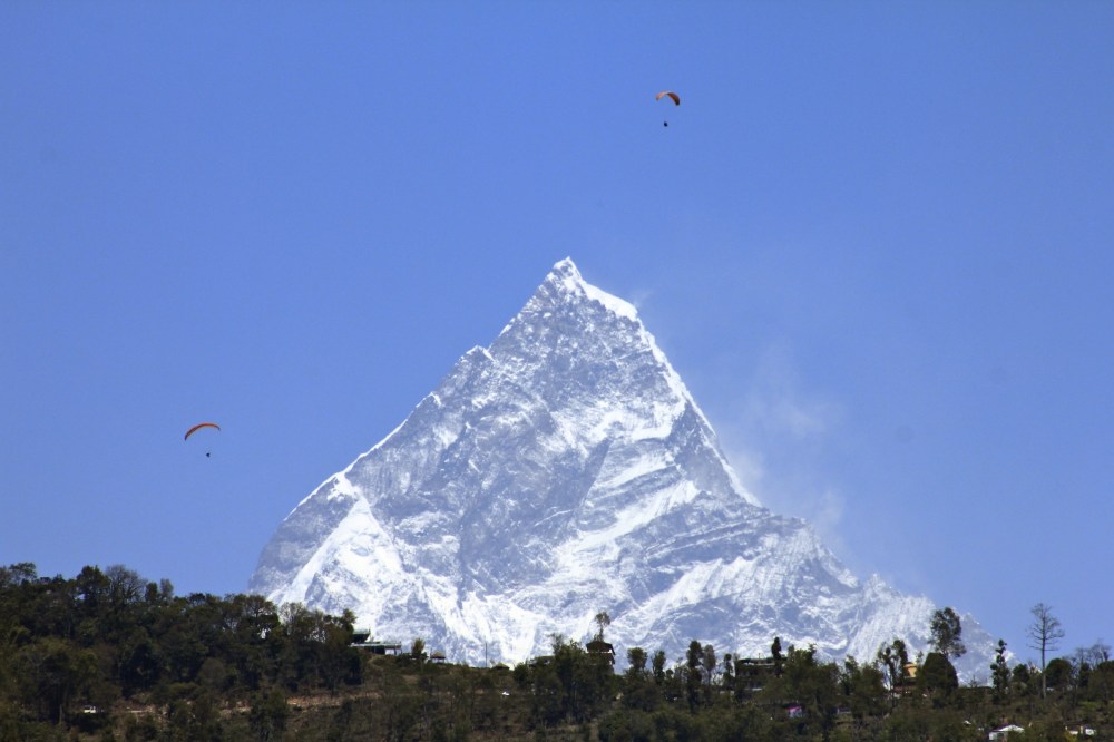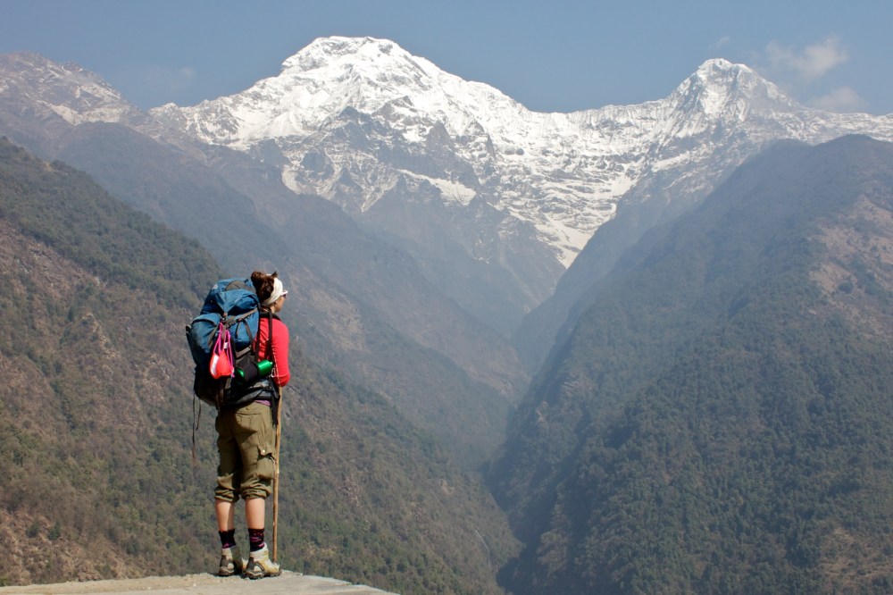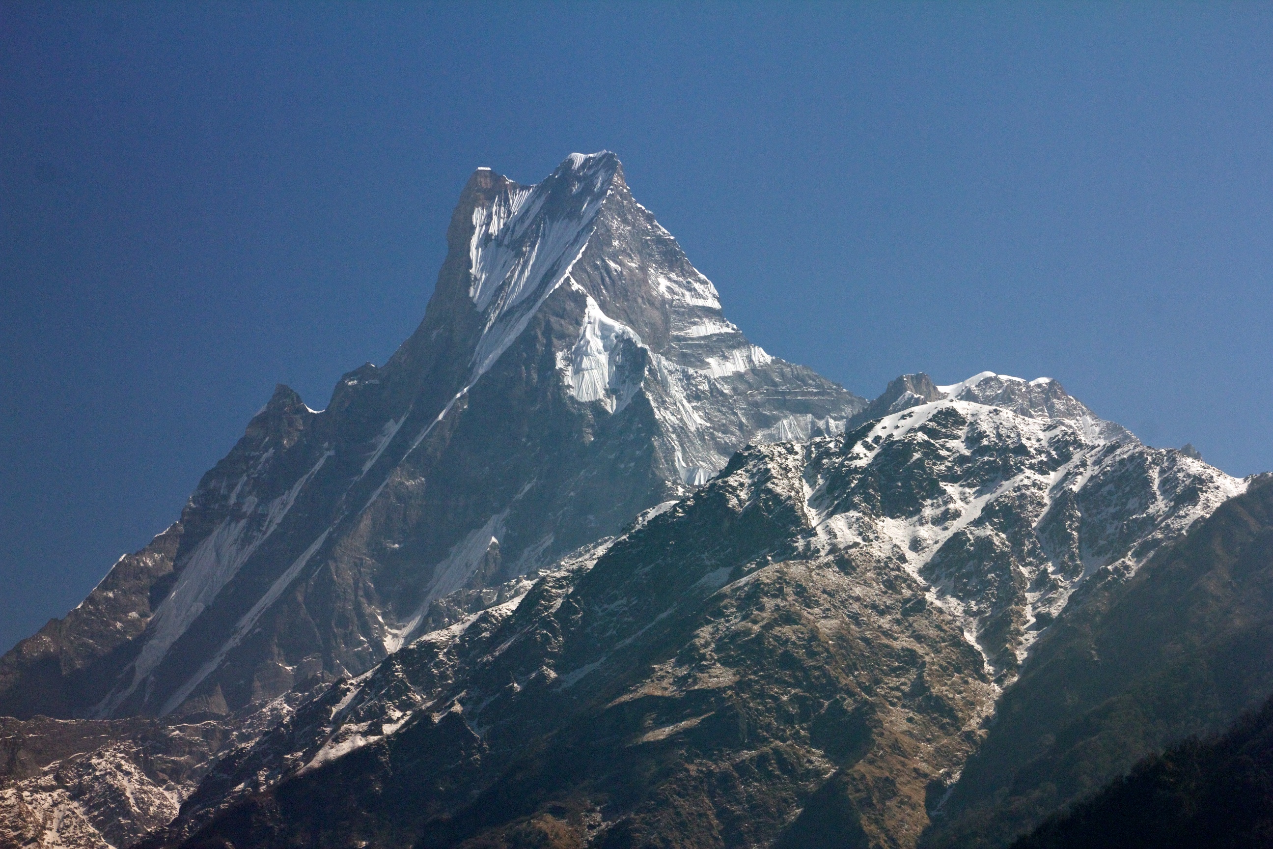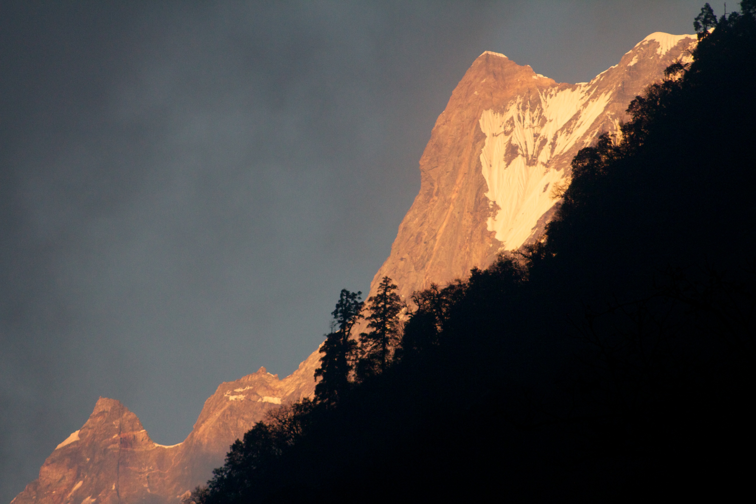 The trail then drops steeply back into the valley and we see it rise again on the other side, shuddering slightly at the thought of having to return back up these steps, but worry is easily forgotten in favour of jaw-dropping mountain scenery and untouched forests of rhododendron, oak and bamboo, the latter of which happens to be the name of our destination. In these protected valleys, birds hurl their songs across rivers, orchids cling to oak trunks and Himalayan Langurs tentatively peer through foliage before vanishing in a leap. While Bamboo is only 500m higher than Jhinu, the path climbs 1300m and descends another 800m, leaving us exhausted. As the sun sets, the evening cloud momentarily parts allowing for a lensful of an bright orange Machhapuchhare, the sacred and unclimbed 7000m fin of rock known as the “fish tail”.