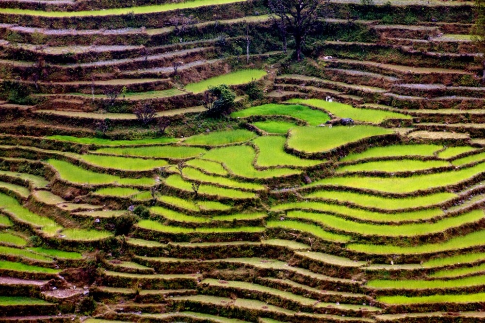 As beautiful as Pokhara is, we couldn’t wait to leave. We did some last-minute provisioning and paid some hefty “park” fees, and hired a car to take us out to Phedi, and the beginning of 9 days of relentless hiking. The paths are steep, and solidly built with fitted slate stones quarried during the construction of the trail. The workmanship is clean and smooth, allowing for a confident stride up the thousands of steps. Soon our ambitious stride slows to a lumbering step and we started to take in our surroundings. Green terraces are cut into both sides of the valley and strive to turn steep hillsides into food for the villagers that work them. The Rhododendron forest we hike through provides welcome shade, as the valley bottom we’re climbing from was easily 25-30 deg C in mid-March (interesting fact: Nepal is at roughly the same latitude as Egypt or Florida, yet Himalaya means “home of snow”). Local villages are strung along the paths at regular intervals – usually 2 or 3 kilometres up or down, never across, and our first day rises over 1000m to Dhampus and Pothana, but overcast skies hide the snow-capped mega-peaks that allegedly surround us.