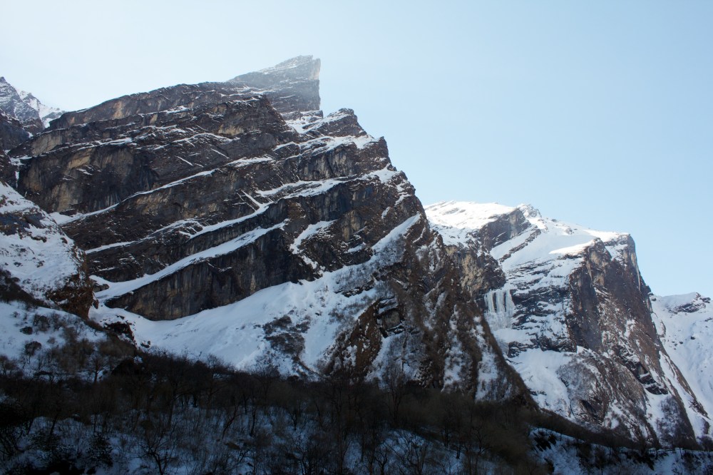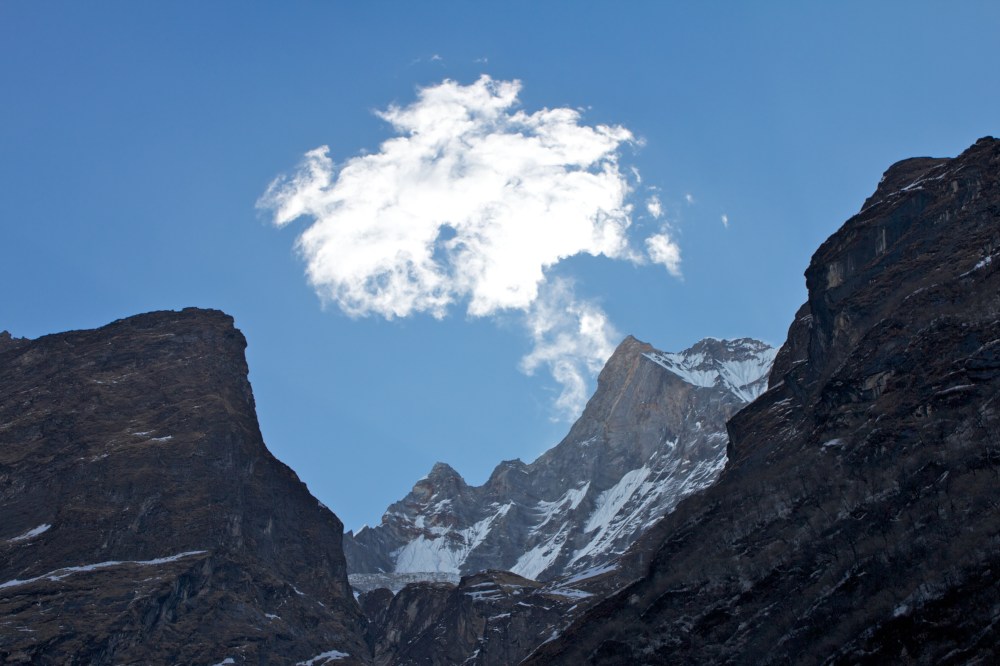 A strict diet of antibiotics and “Gastro-Stop” has apparently cured me, but the illness has drained my energy. Thankfully, the lemon tea and crisp mountain air clear my head and my feet move slowly but confidently. The trail snakes along the narrow valley bottom bounded by Machhupuchhare on the right and a 6441m wall known as Hiun Chuli on the left. As we leave Deurali, we are rewarded with clear views of Gangapurna and Tare Kang (Glacier Dome) with snow blowing from their 7000m peaks off into space. These white monsters look like party crashers in the lush forest but we quickly leave the bamboo behind and climb into a land of snow and rock where the mountains ARE the party.
