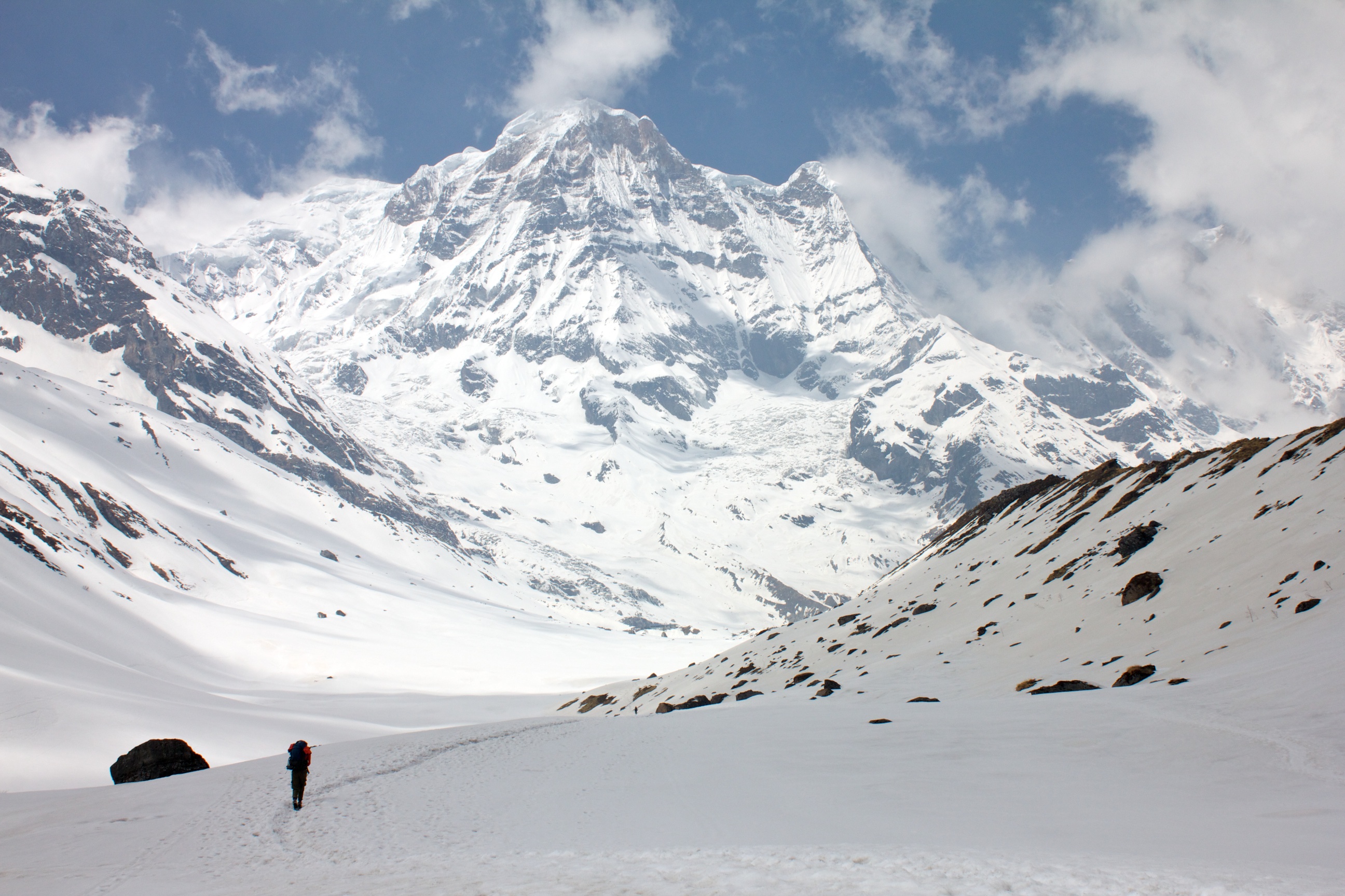 By midday we reach Machhupuchhare Base Camp (MBC) at 3700m and finally get to see up the dog-leg valley into the heart of the Annapurna Massif. South Annapurna is directly ahead with the mighty 8091m Annapurna I looming over everything. As we leave MBC under the South Annapurna Glacier moraine we marvel at some ski tracks on the north face of Hiun Chuli before the afternoon clouds roll in and the snow starts to fall. We reach Annapurna Base Camp (ABC) and throw our packs down, exhausted at 4130m. We are reunited with our tramping Kiwi friend Miriam at the Snowlands Lodge and are the only three guests booked in for the night. This seems surprising until the lightning storm starts to rage outside and brings with it graupel and shivering porters in garbage-bag rain shells. The low rumble of ice and rock are falling in the mountains around us only stops when we retreat into sleeping bag cocoons and fall asleep.