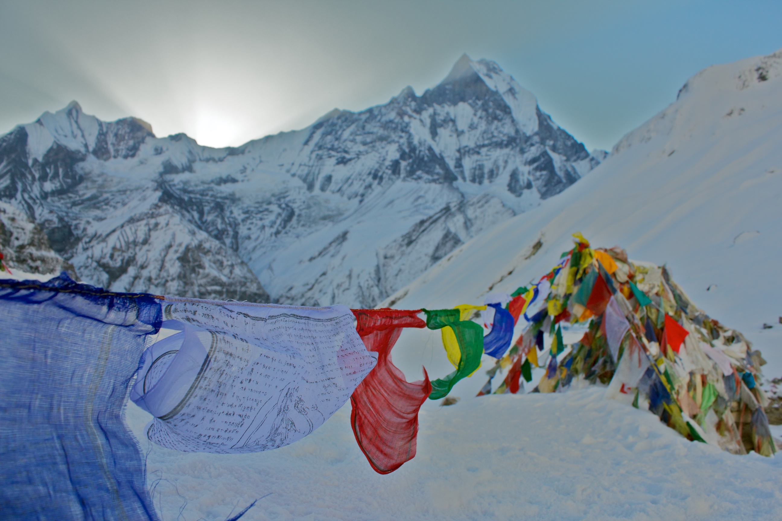 I awake at 6 to the sound of heavy mountaineering boots stomping by on the snow-covered boardwalk outside. I perform a well-practiced sleeping-bag change, grab my camera and step out in the brilliant morning alpenglow. The clouds are long-gone and the massive 8091m peak of Annapurna I is the first to reflect the suns rays. As the light works its way down the walls and finally strikes the glacier and ABC, numb hands pull cameras from cases and the air is filled with shutter clicks and frozen breath.