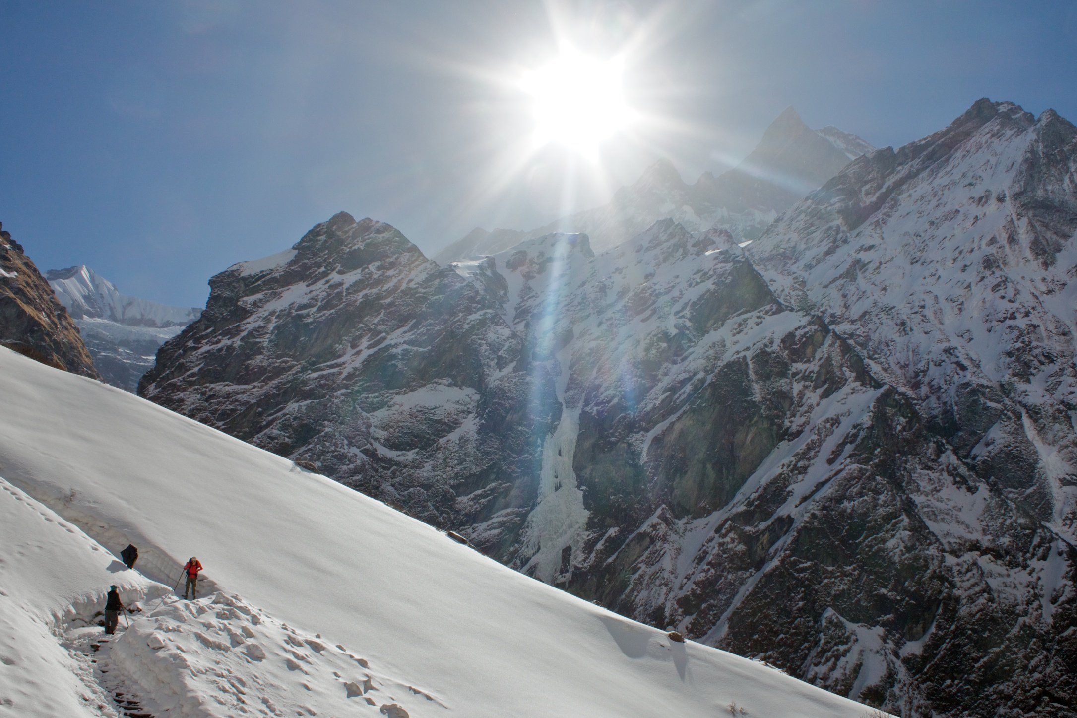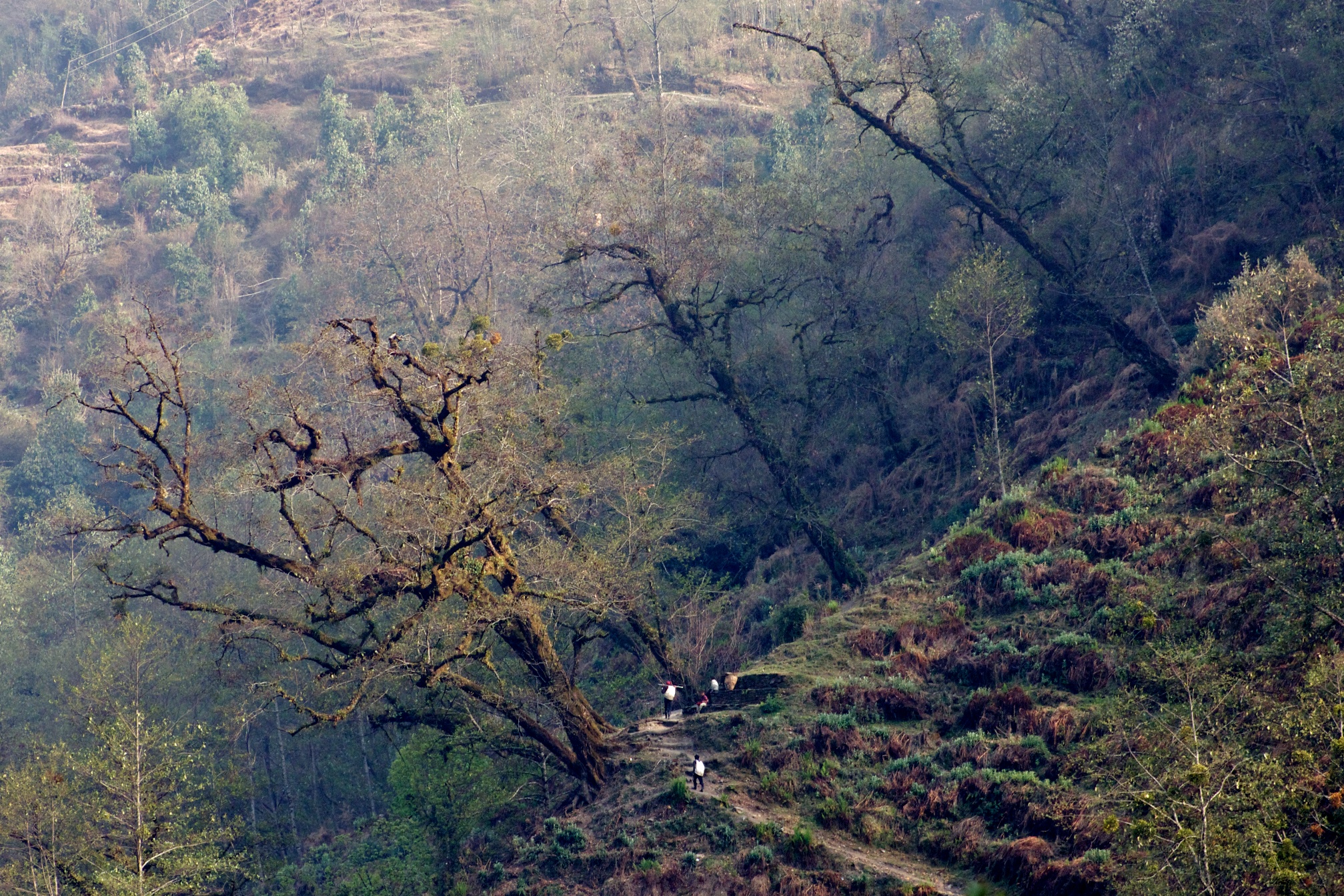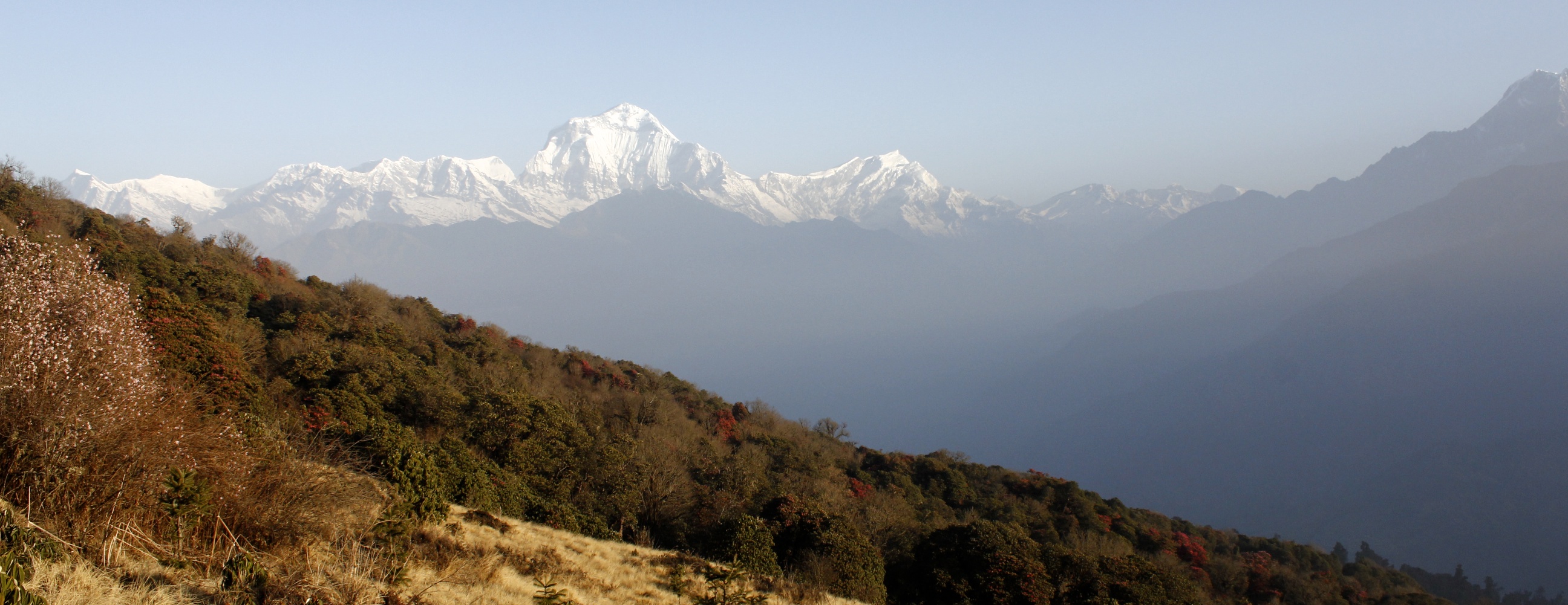 The valley is filled with a light mist that is just opaque enough to obscure the mountains. The morning climb puts us up to Tadapani as the haze lifts and we get a new spectacular perspective of Annapurna South and Hiun Chuli.