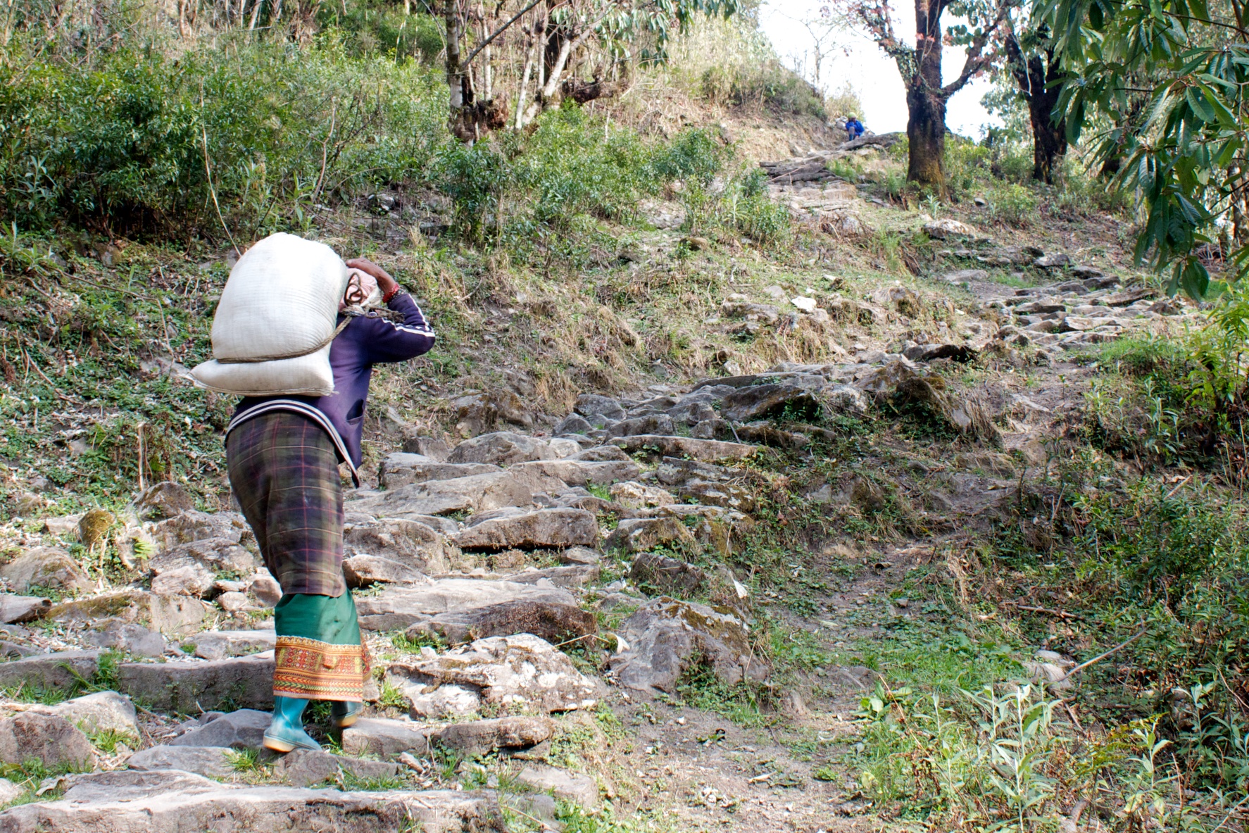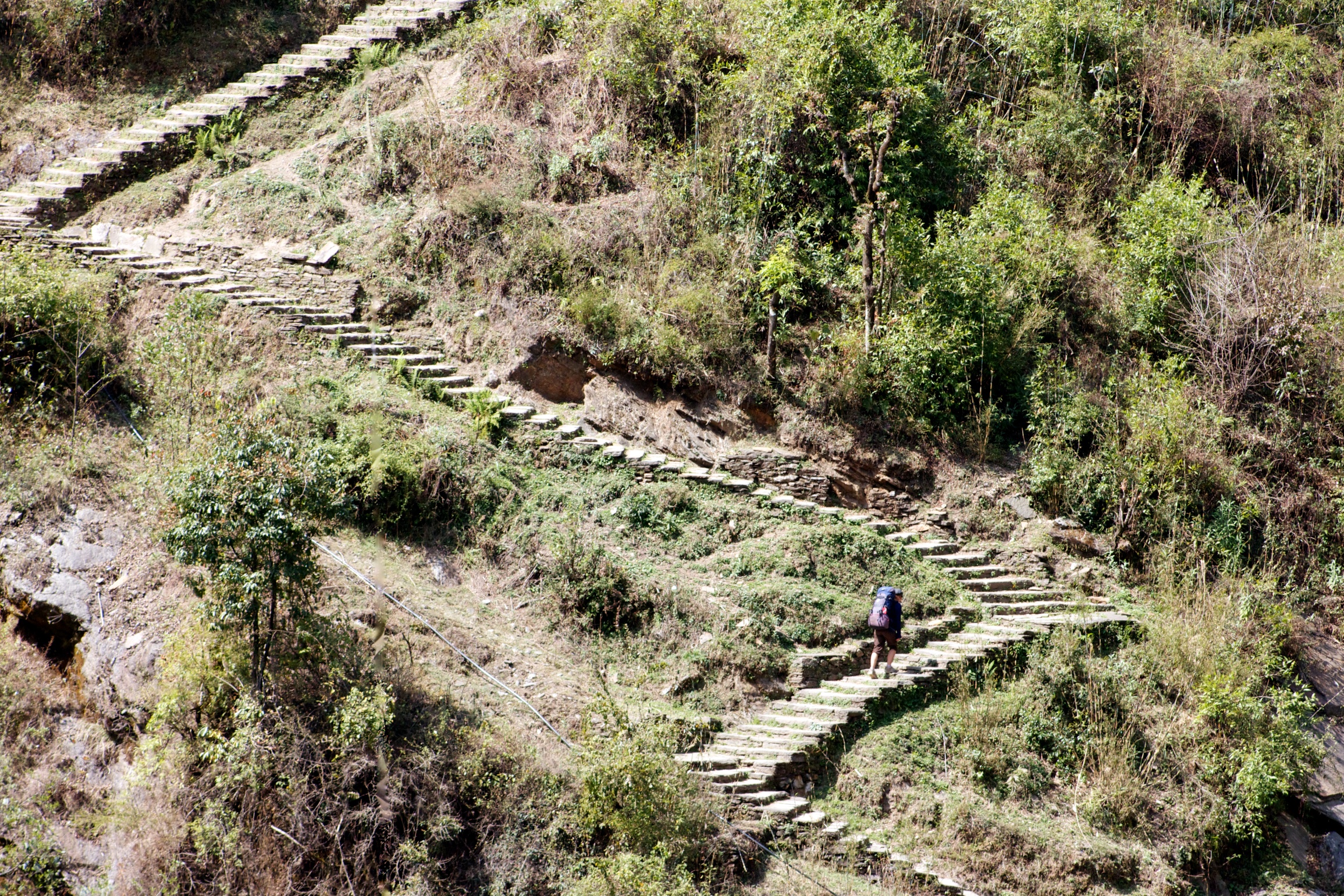 Content with the views and a cup of tea, we start back down to breakfast and the long walk down. The trail between Ghorepani and Nayapul is a traditional Nepali highway – horses, donkeys, goats, porters and trekkers all vie for space on the narrow steps.