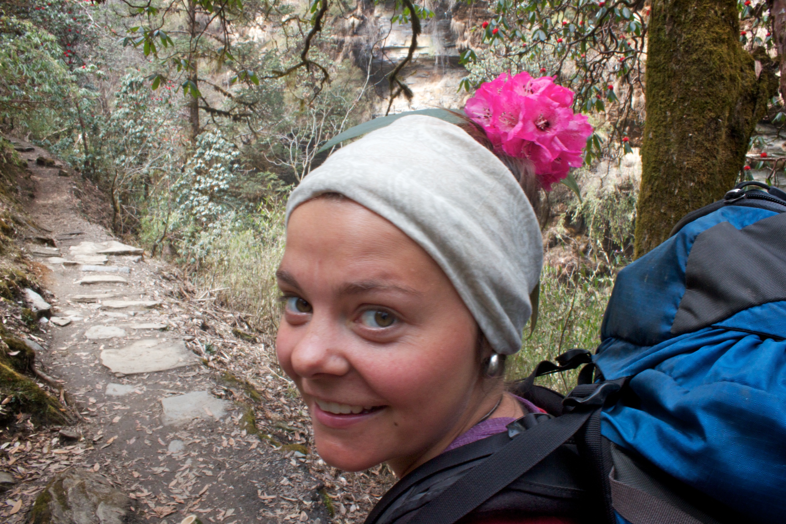 After lunch under another cliff at Ban Thanti, the trail follows a babbling series of waterfalls up into what can only be an enchanted forest. We clamber up and over another 3200m pass to be marvelled by wispy but dense clouds racing up one valley and flowing into the one we just came from. We follow the rhododendron ridge down to Ghorepani and prepare ourselves for a pre-dawn assault of Poon Hill.