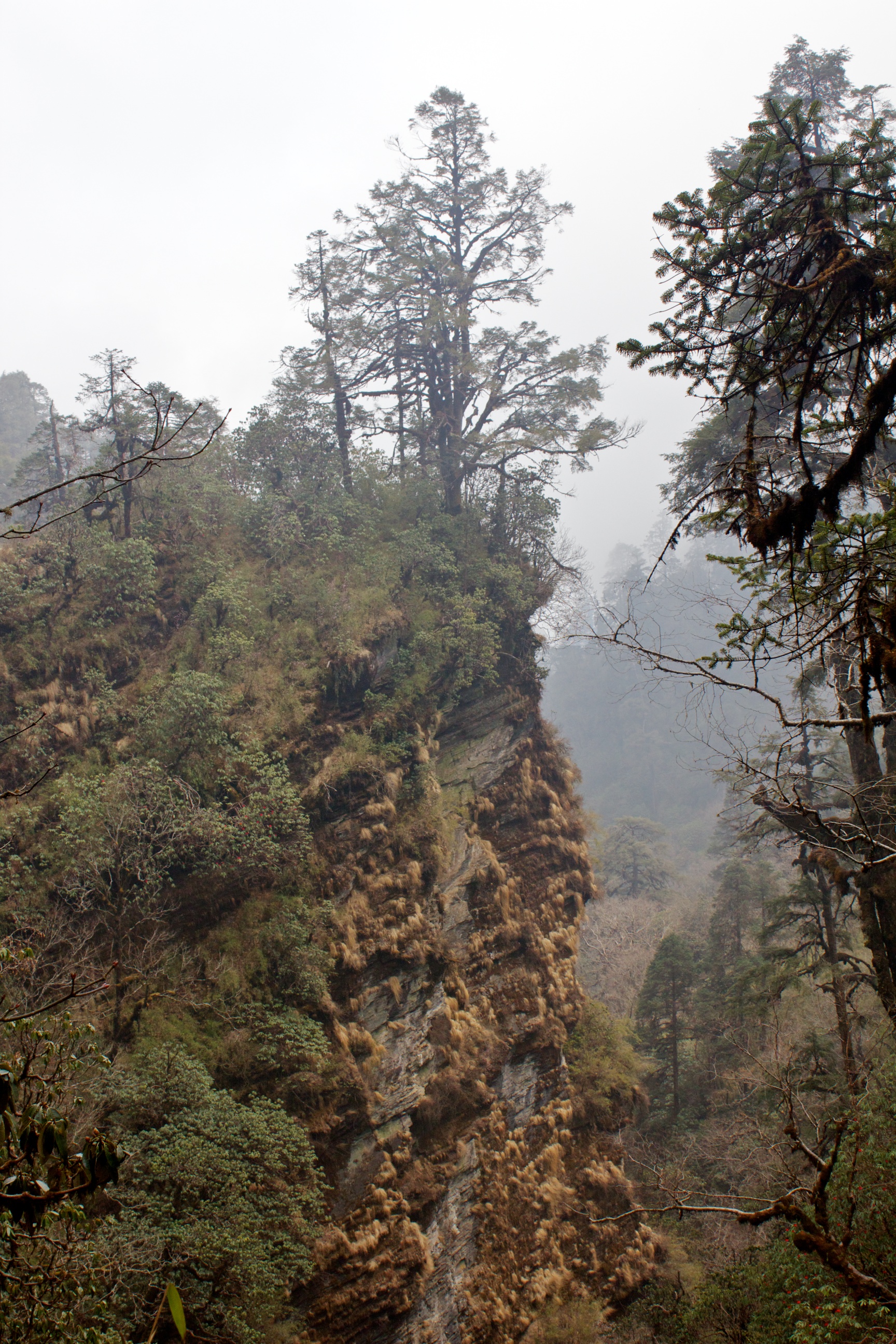 The morning air is alive with birdsong and the dense rhododendron forest is in full bloom. The trail drops back into a tight valley and the hot sun only rarely penetrates the lush canopy. We make slow progress as I stop to snap the abundance of flora and fauna, and then movement catches my eye high up the cliff above. Langurs! A whole troop of the black-and-white monkeys have apparently made their home on the cliffs of the same colour and we caught them just as they are leaving to forage.