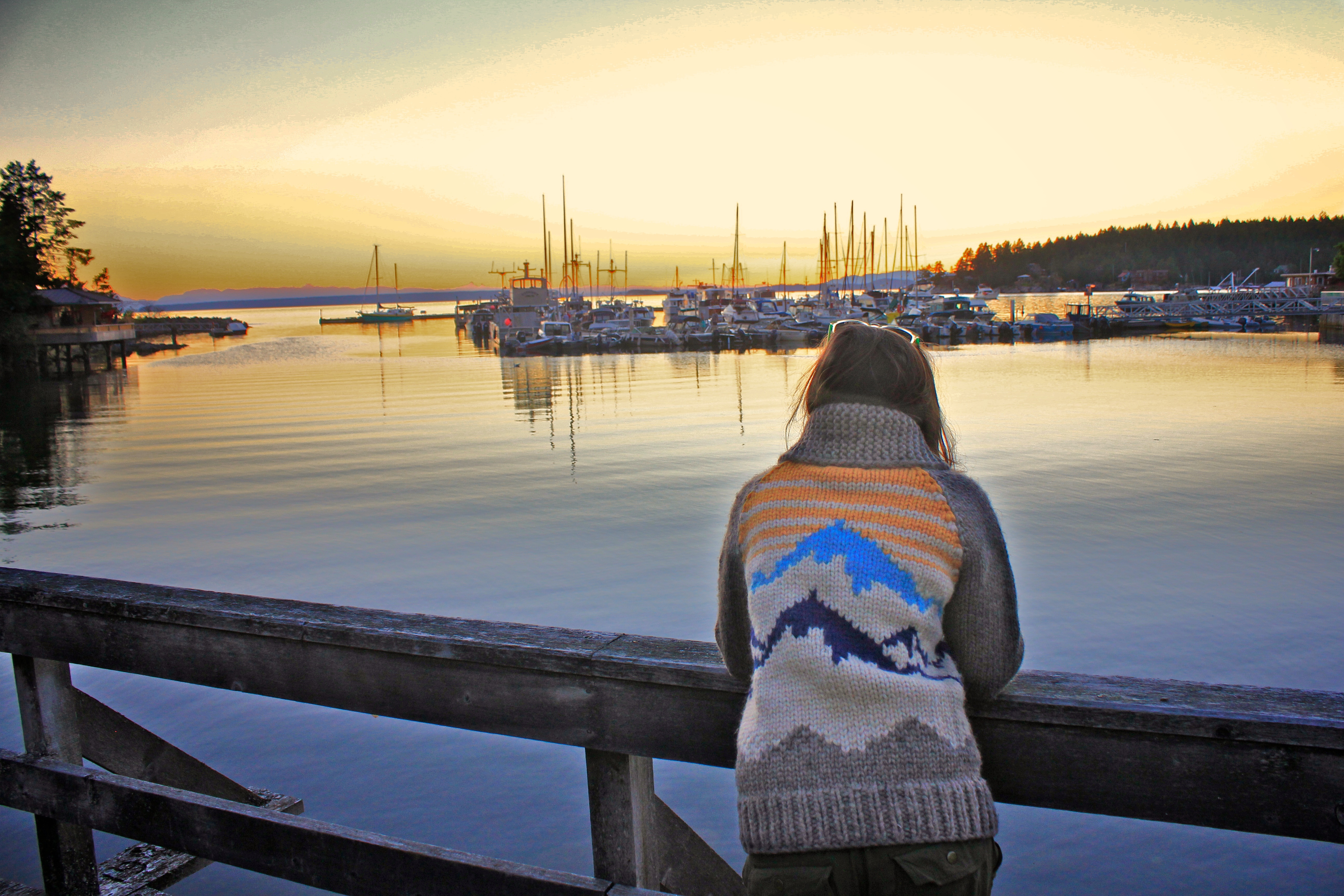 Caroline staying cozy in her Granted knit on the harbour in Lund
