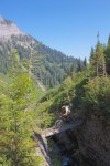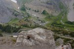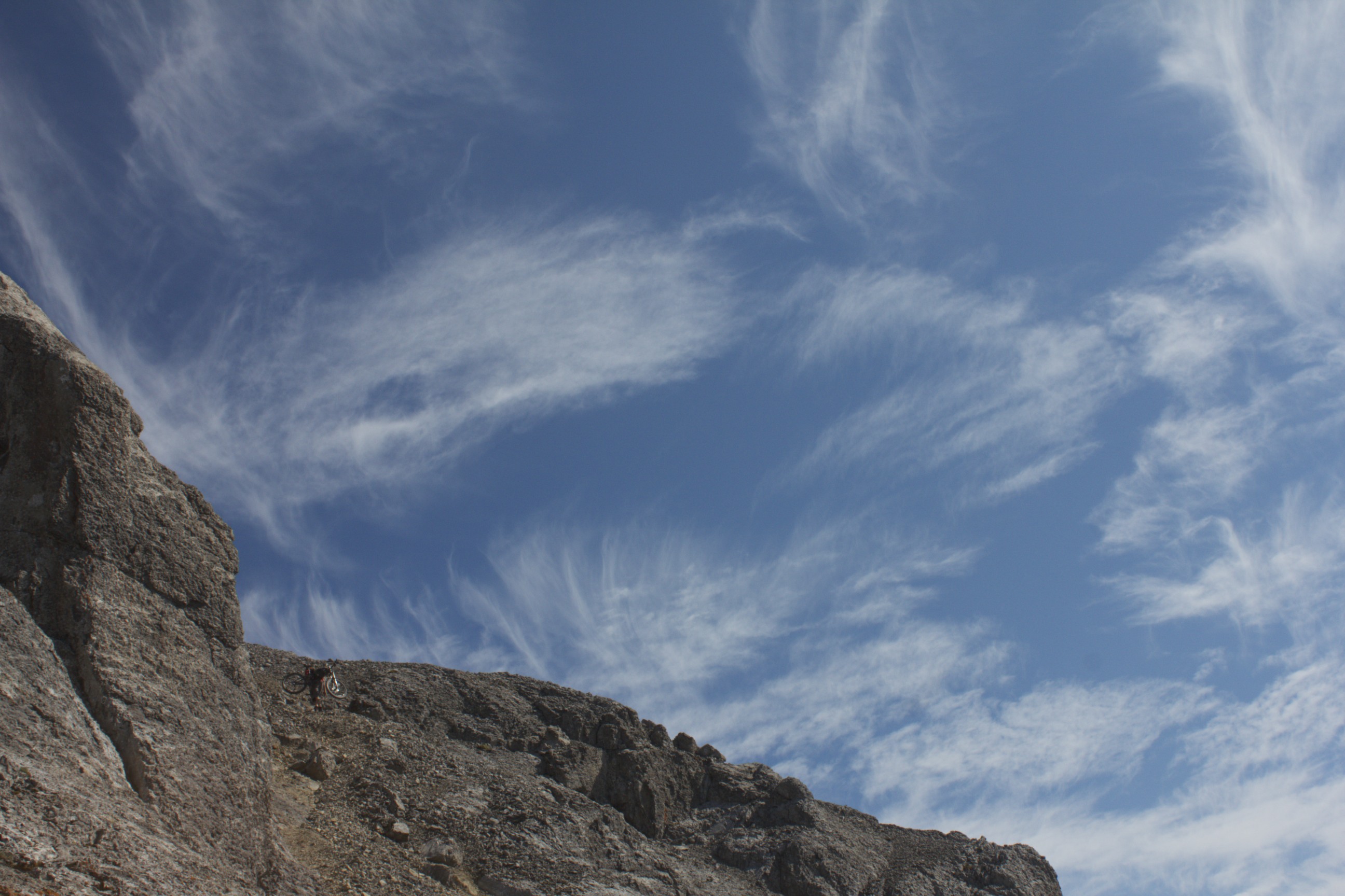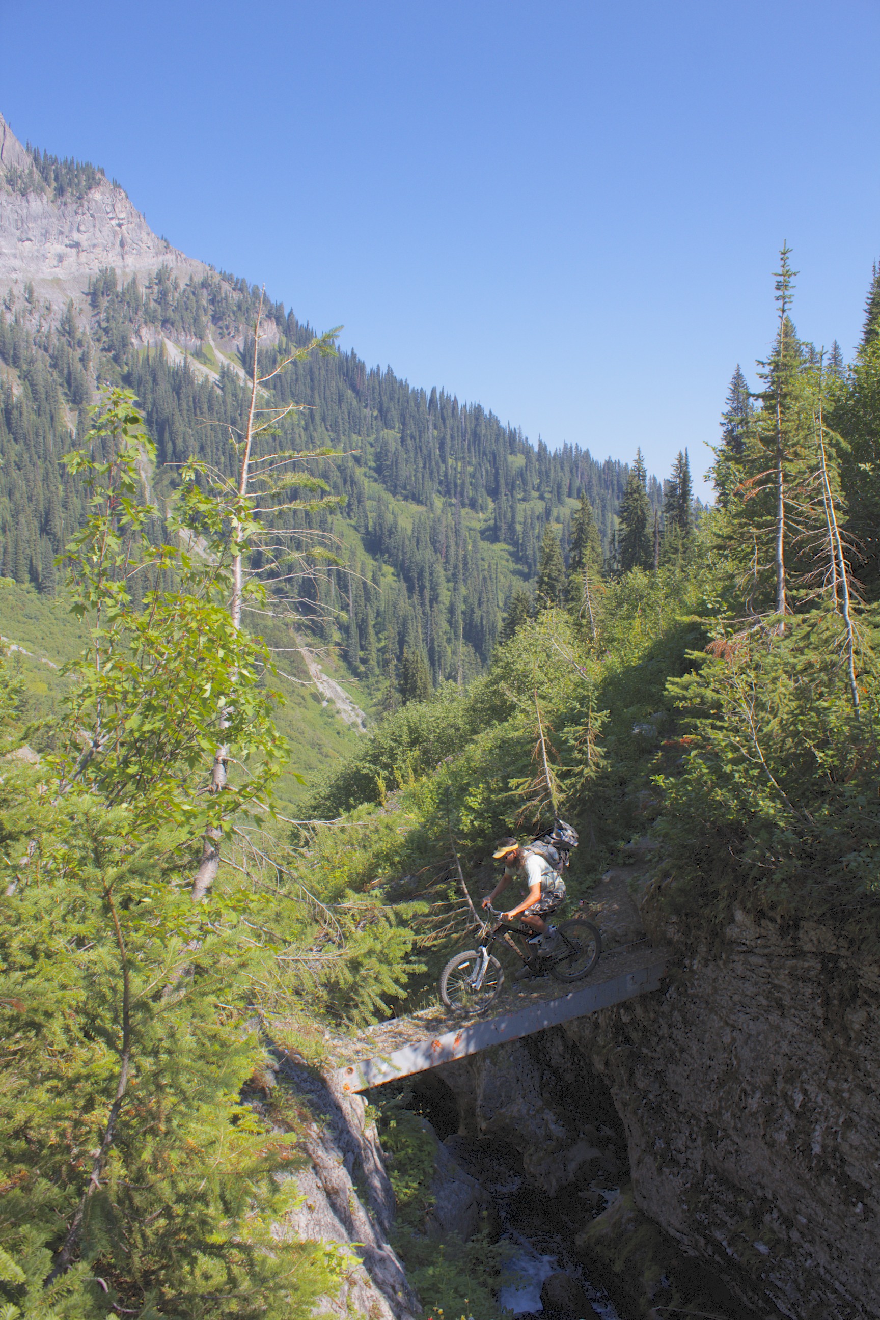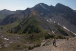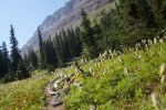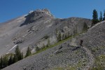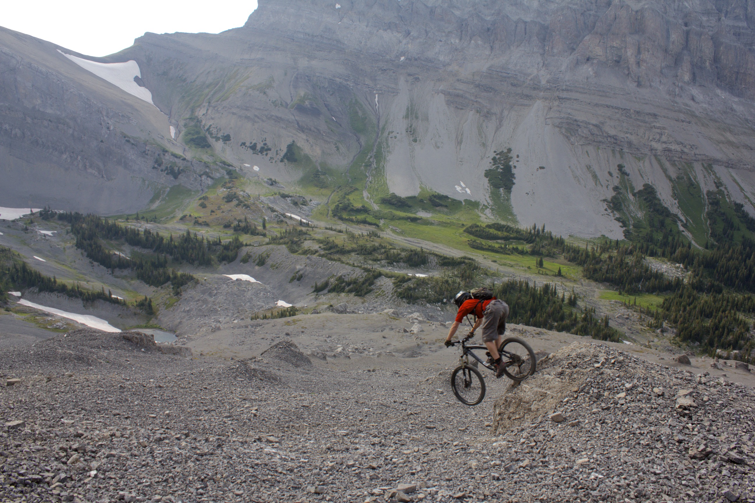 The trail off the top of the middle sister is an off-cambre scree and chundery rock nightmare, which is really fun until you weight your front tire and push the whole scree-berm downhill. Then it’s to the top of the MEGASLAB and 5 minutes of contemplation and photos before creeping into the longest slab of rock I’ve ever seen. The face rolls over a convexity so from the top you can’t actually see the bottom, but you’re fairly sure that there’s a line down there somewhere to right and go for it. As slowly as you possibly can. The photos do a slightly better job of showing the slab, but it’s still nothing compared to the total commitment and fear I felt when dropping in. Needless to say, we made it down without any real difficulties (Henry misplaced his bike near the bottom) and enjoyed the endless scree and beautiful meadow singletrack back down to the truck. Some sketchy steep corners made the beer stashed in the creek at the bottom all that much better.