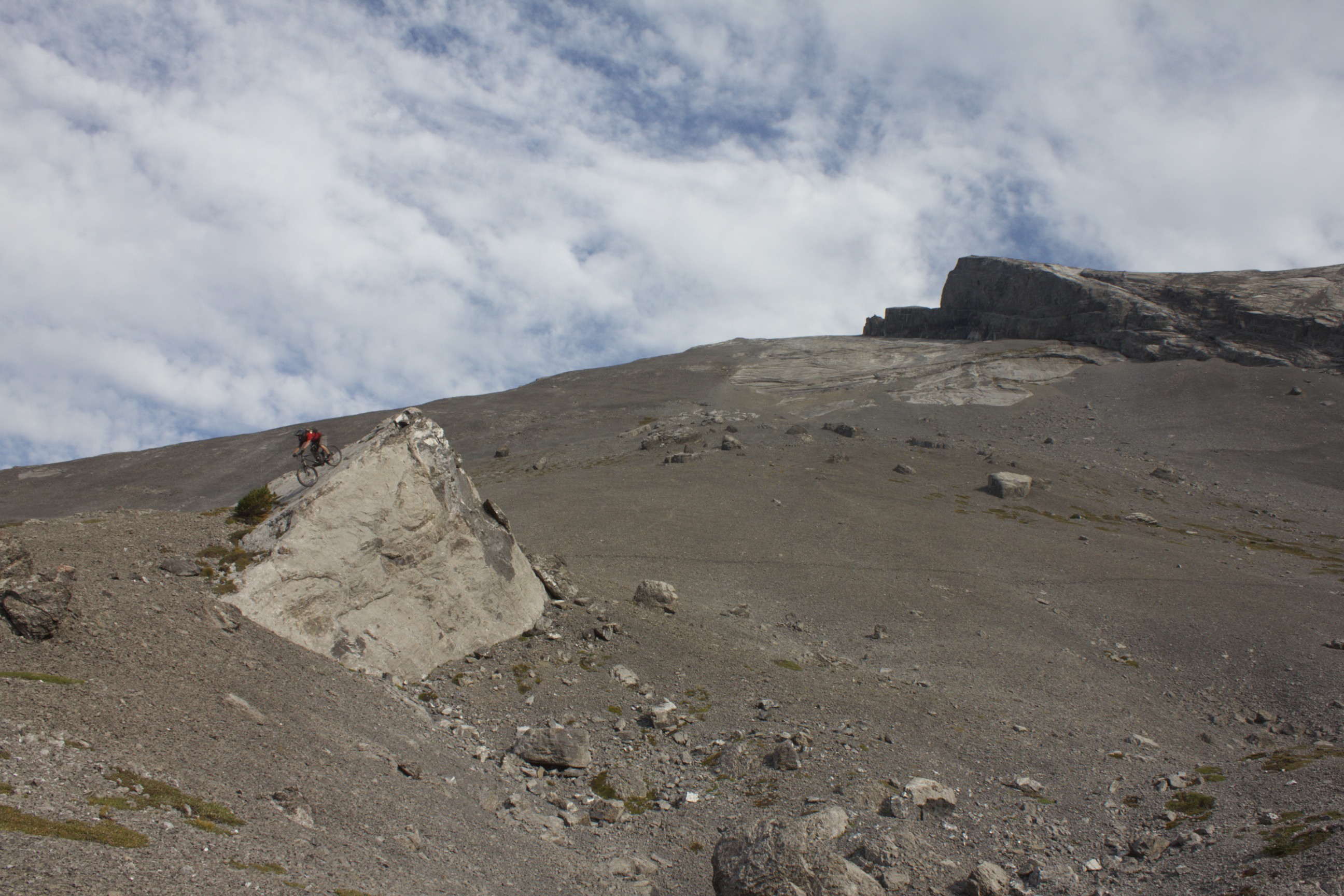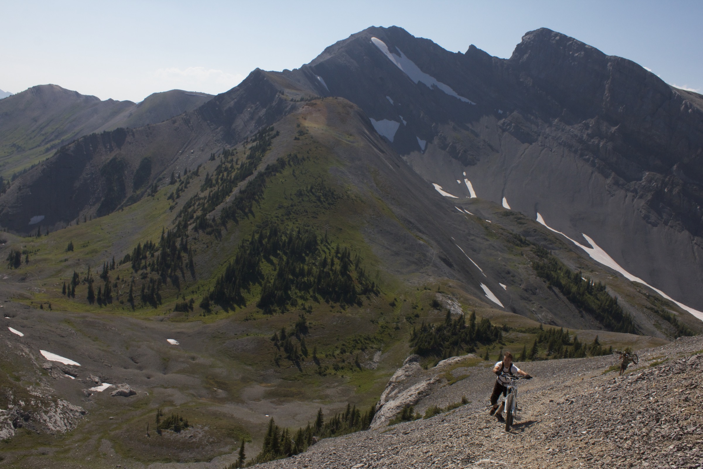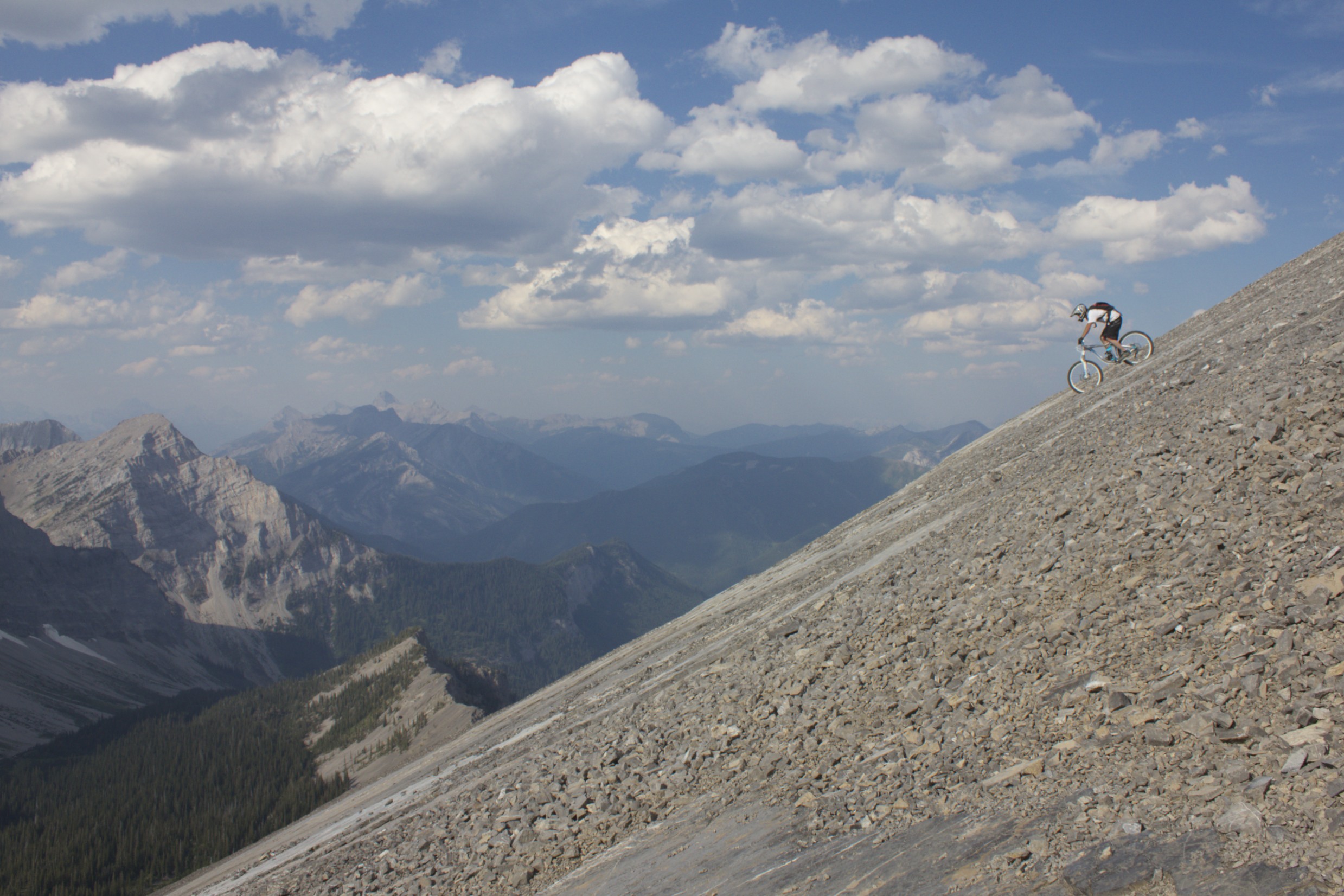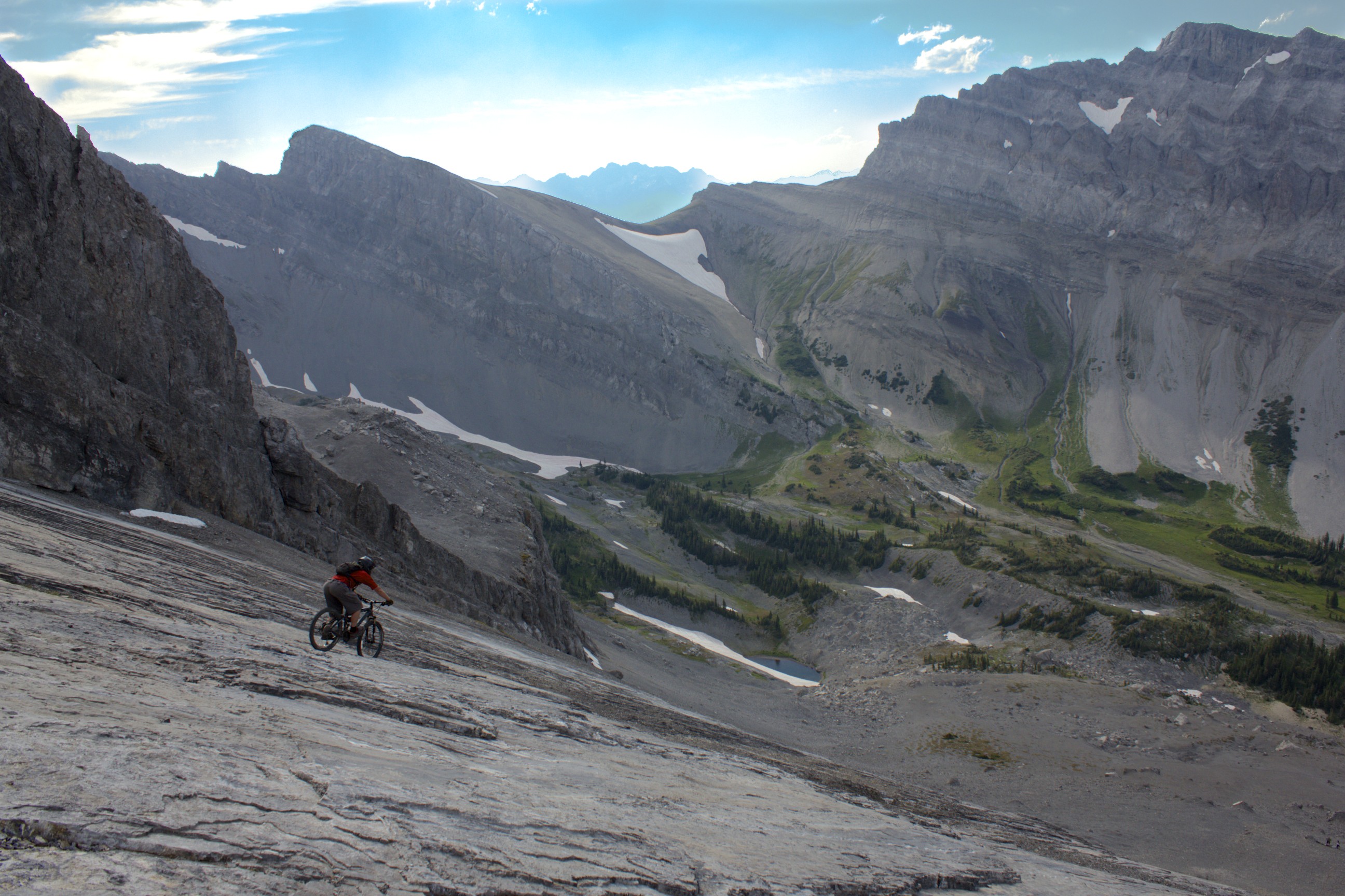 With a wagon full of adventure gear and gasoline I left early for Fernie. Before long I was devouring Keremeos peaches faster than kilometers and was eager to stretch my legs. After a botched attempt to meet friends in Rossland, I pulled the bike out and headed out for a quick evening session on 7 summits. I was back on the road at dawn the next morning and had learned that Luke was arranging a session on the MEGASLAB. I’d heard weird rumors and seen photos that defied my imagination – could I really push my bike up the highest peak above Fernie and ride down 400m of steep, slabby limestone? Turns out, the answer is yes, and it was one of the scariest and most fun things I’ve done on a bike.