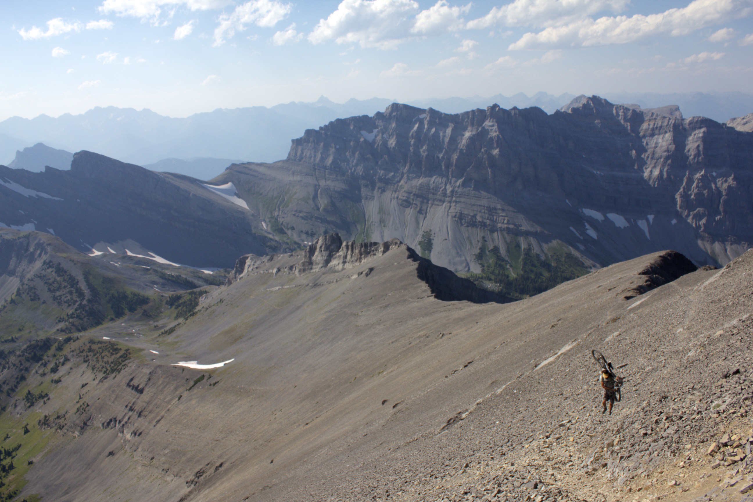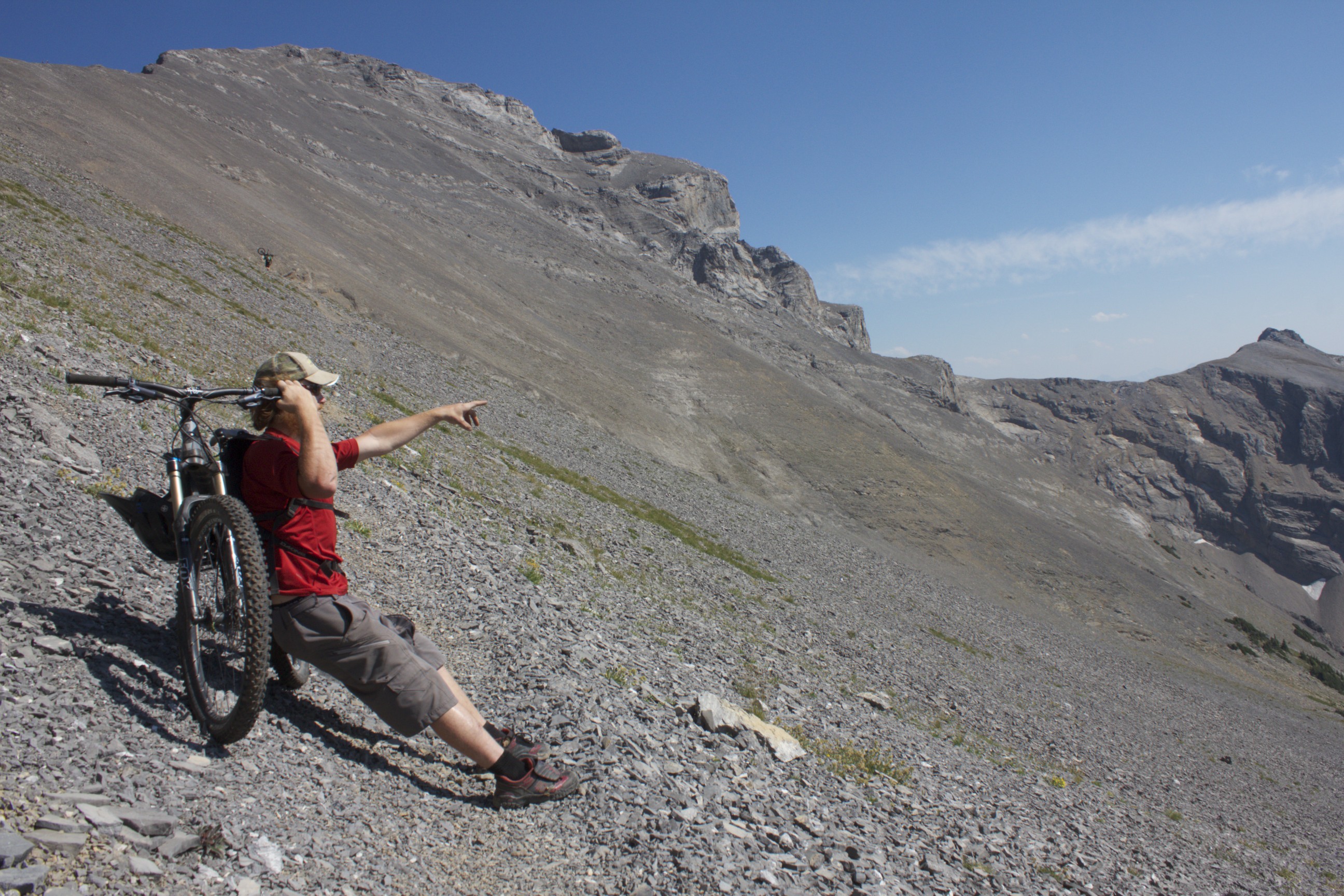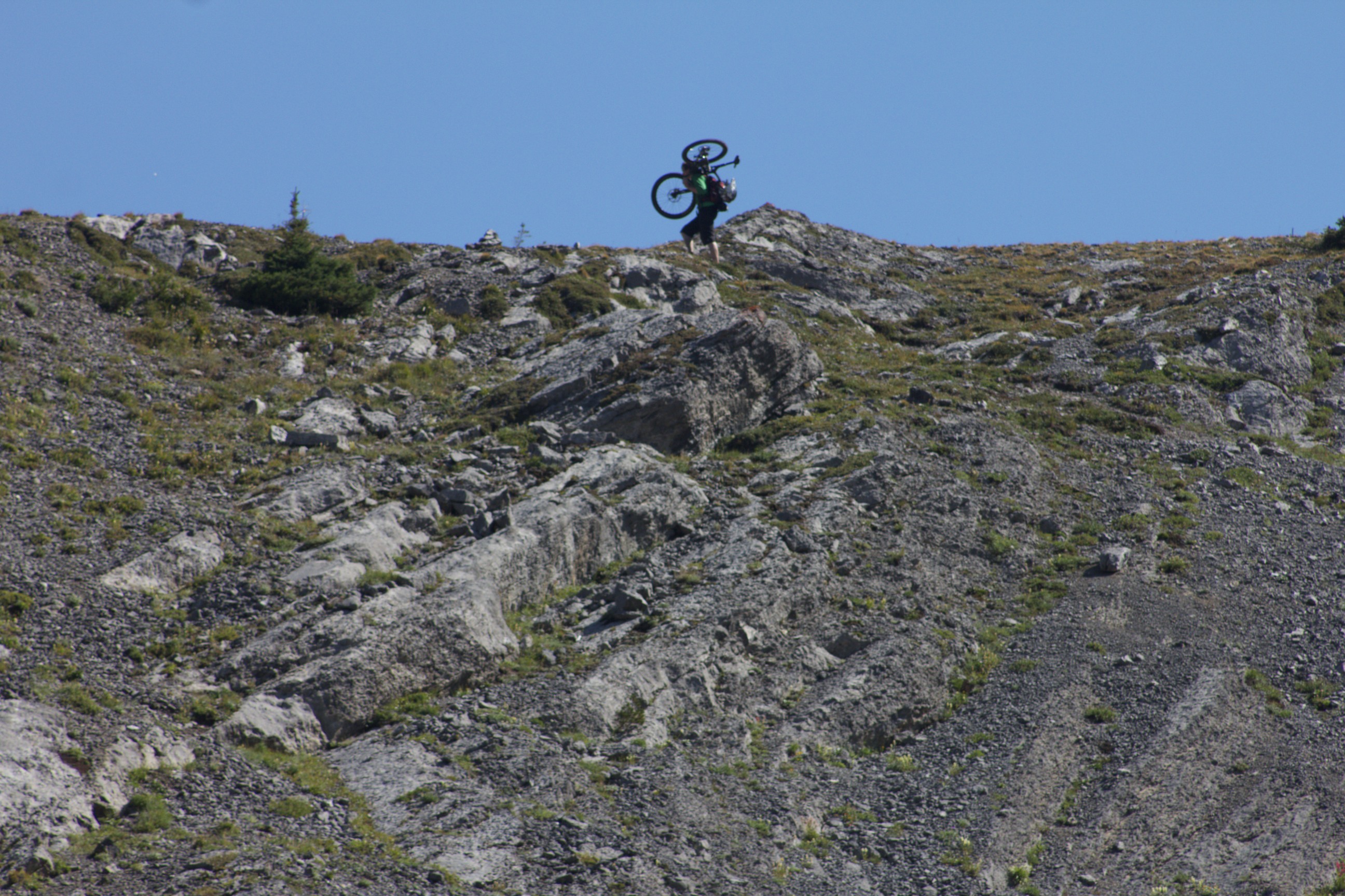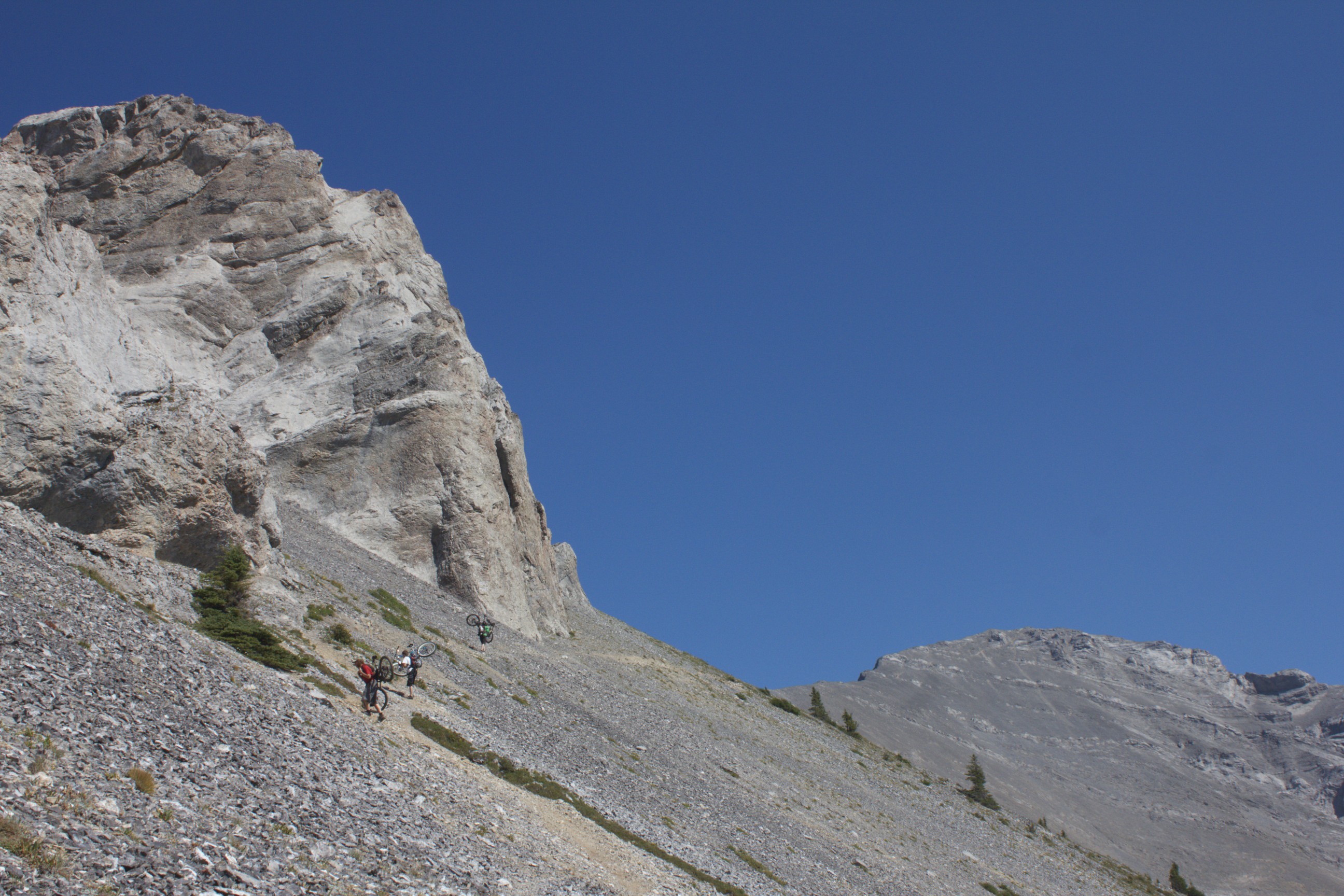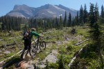 Even being from the Kootenay’s, I forgot about the switch to Mountain Standard Time and rolled up to ConRAD’s house an hour or so late, joining Luke and Travis. With bikes loaded into the truck we headed out to pick up Henry, a task that always seems to eat up more time than should be possible. We’re not slow, we just move at our own pace. The drive up Hartley Lake Rd. is would be hectik in the Sport Wagon, but ConRAD’s truck handles it like a champ and we’re pushing our bikes up Heiko’s trail in no time. An hour later we get our first glimpse of the MEGASLAB, three hours after that and we’re standing on a high alpine ridge overlooking the entire Elk Valley, (not to mention a sizable section of the whole of the Southern Rockies.)