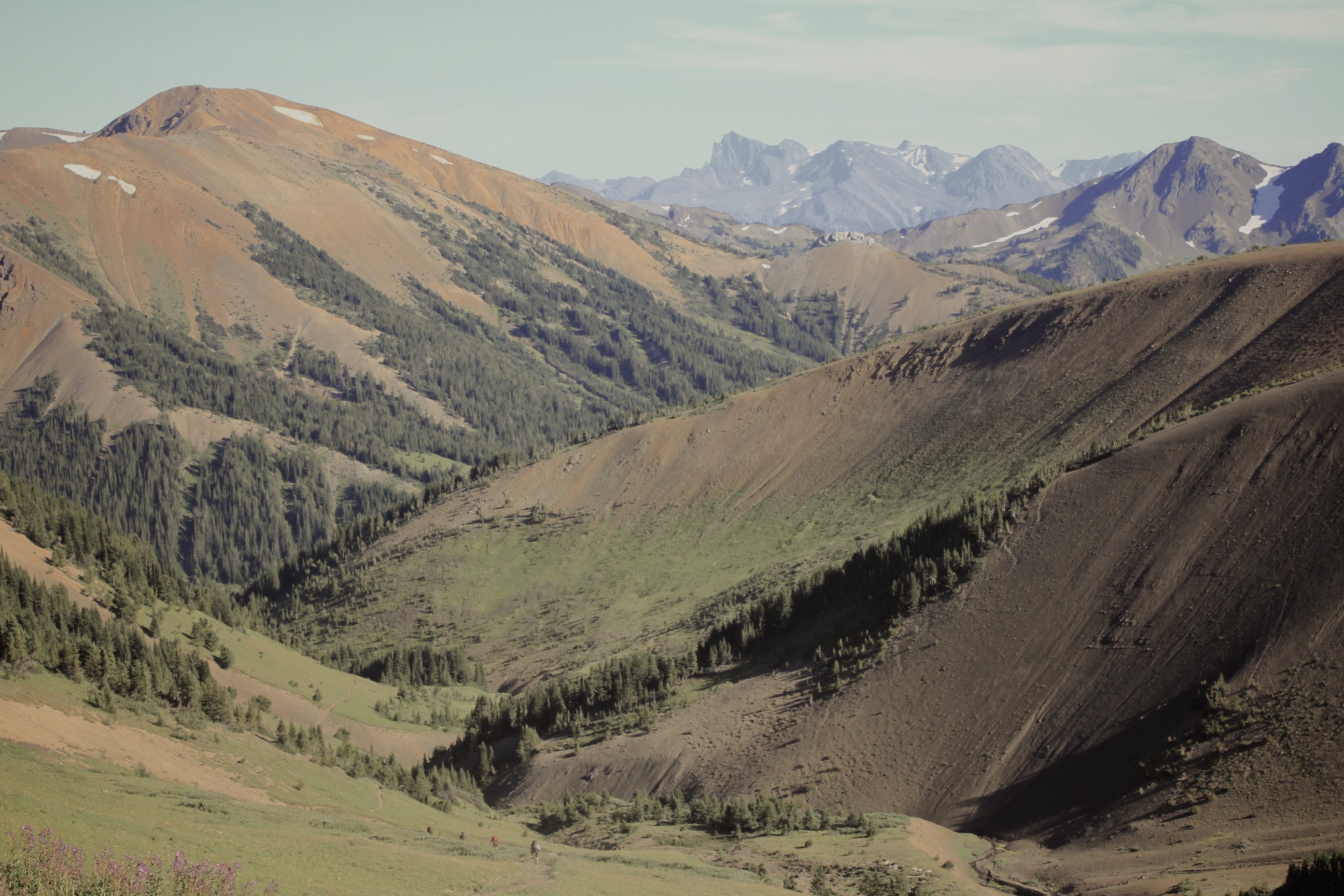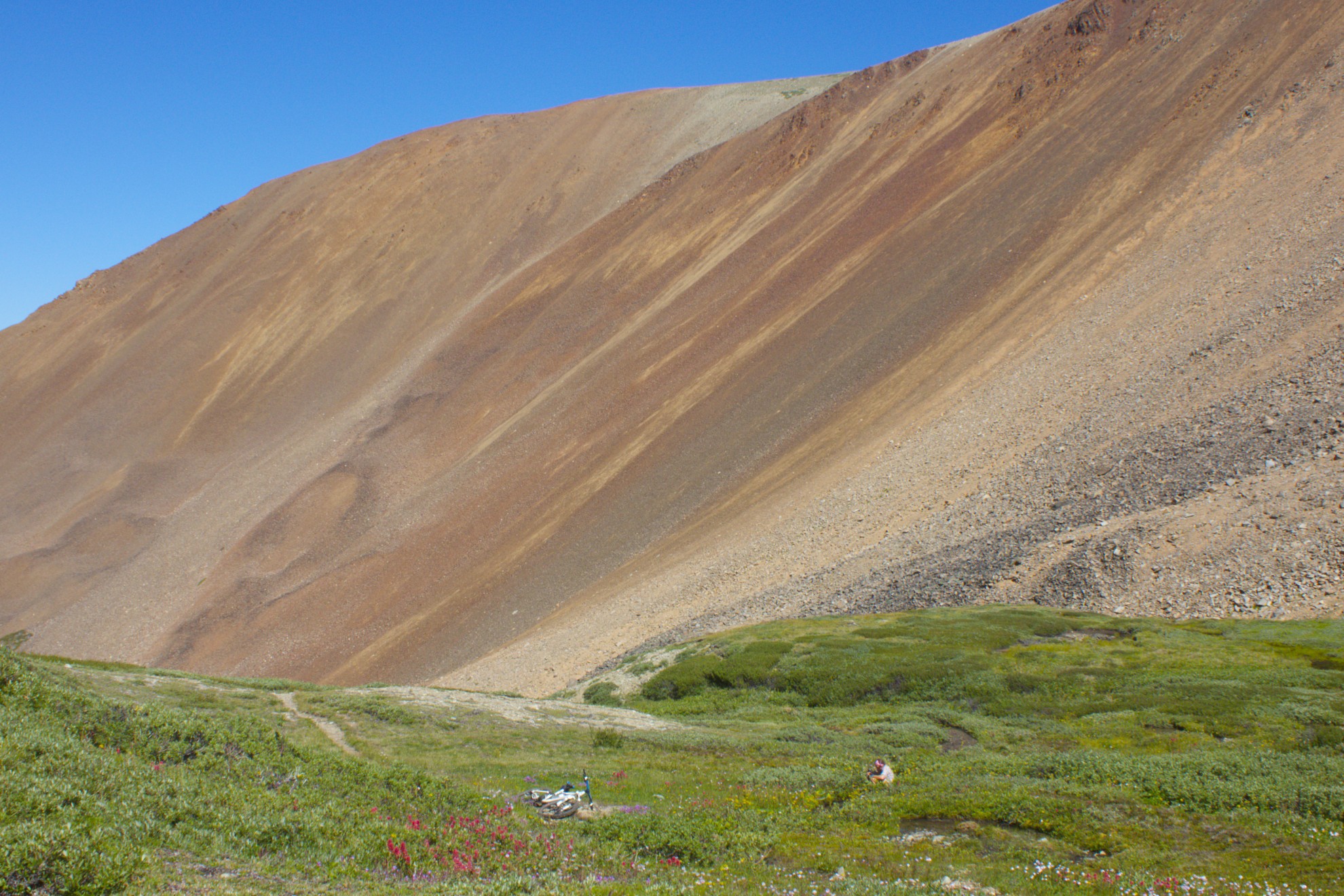 Day three breaks with brilliant sun and a muddy crossing of Big Creek followed by an hour-long trudge through the swamp looking for a trail. Elbow Pass is actually at the head of a hanging valley, so when the climb comes it’s fast and steep. By the time we reach the elbow, the sun is baking us into the 35˚C range and we’re refilling water bottles and bladders at every opportunity. The final push to gain the pass is a steep shot straight up the scree ridge followed by a beauty of a lunch spot tucked in right on the other side. Magnifique!