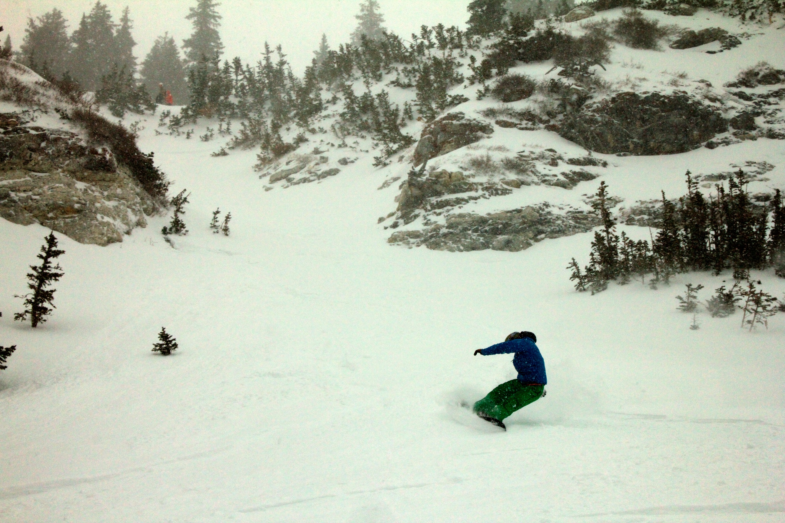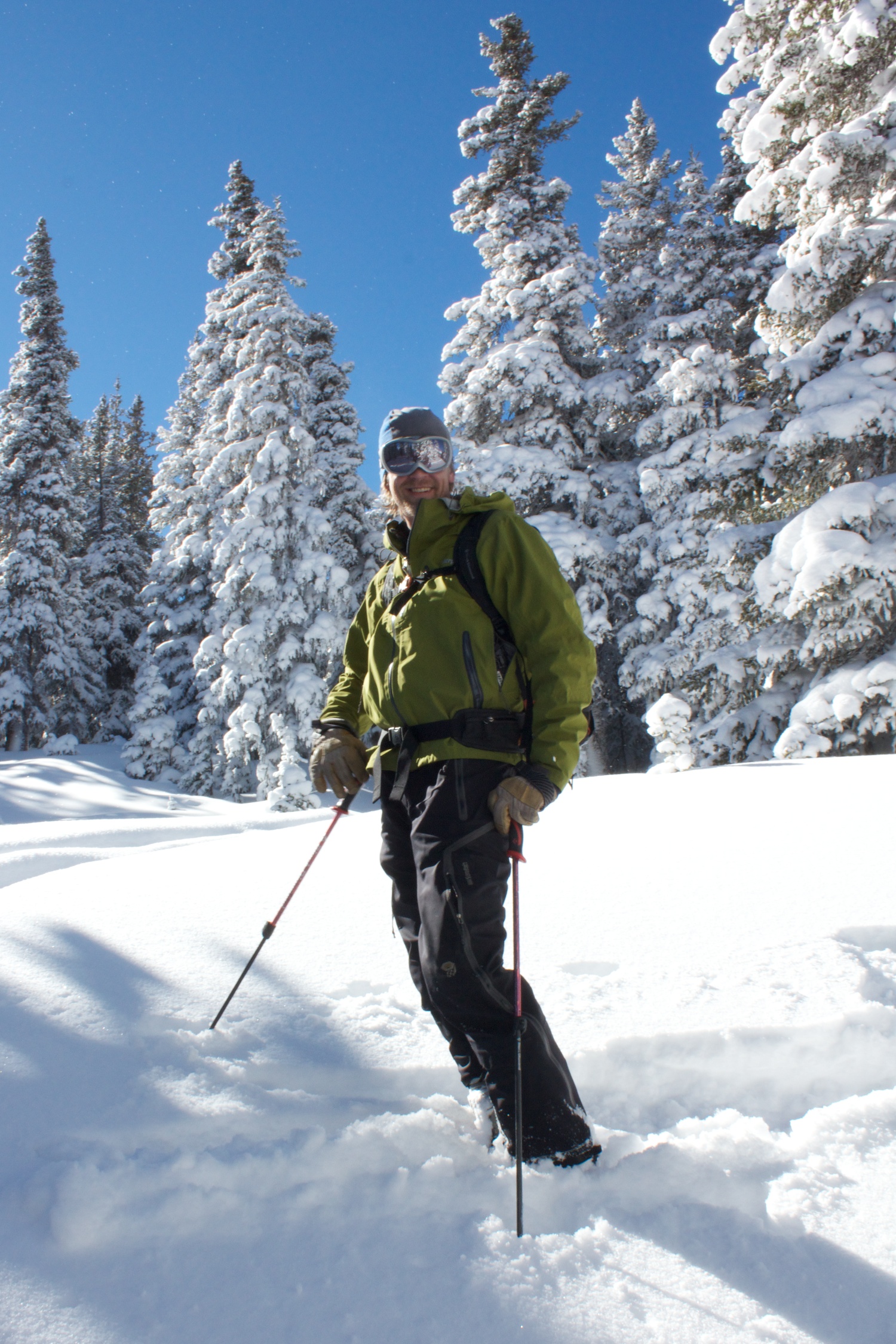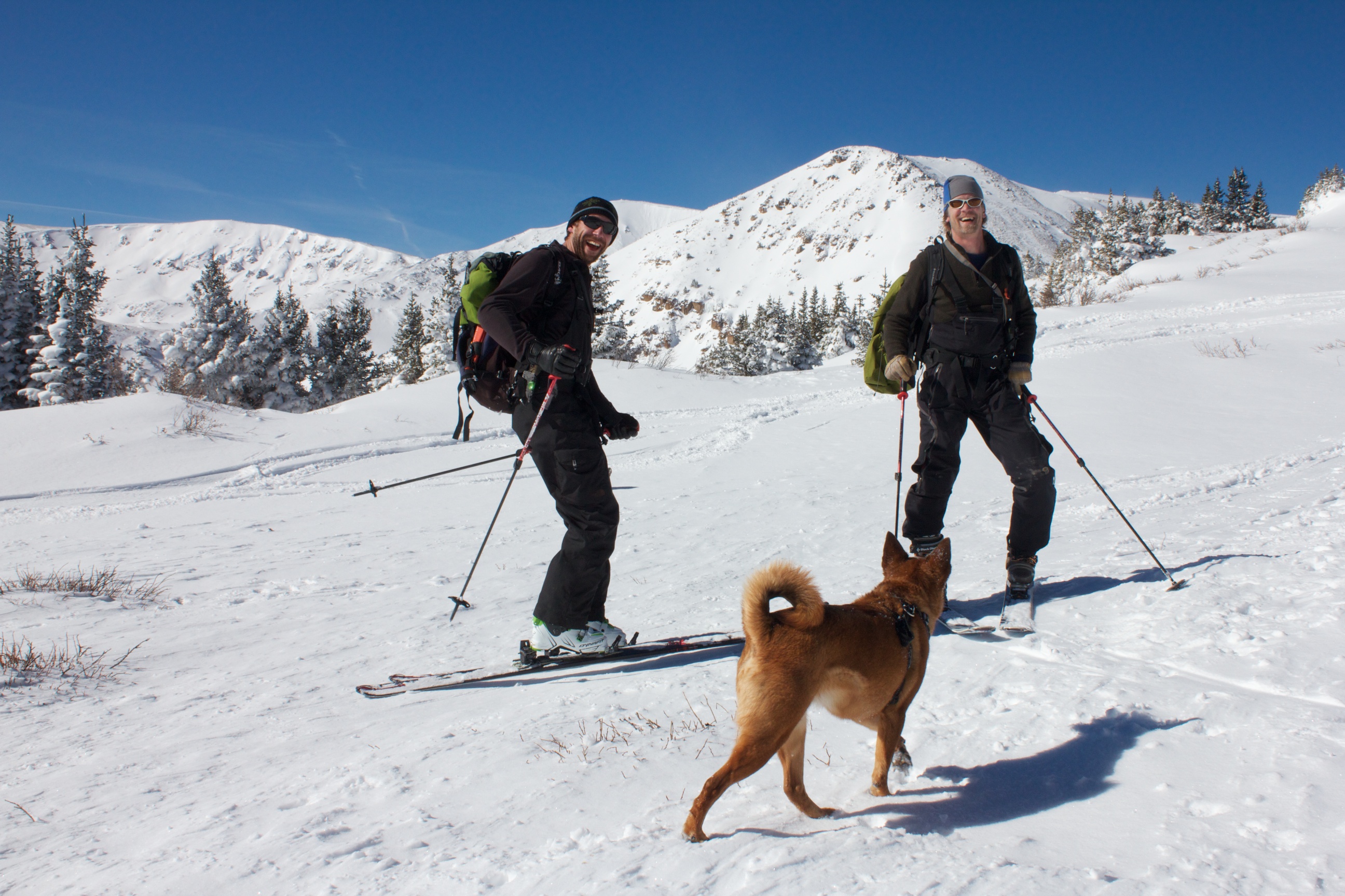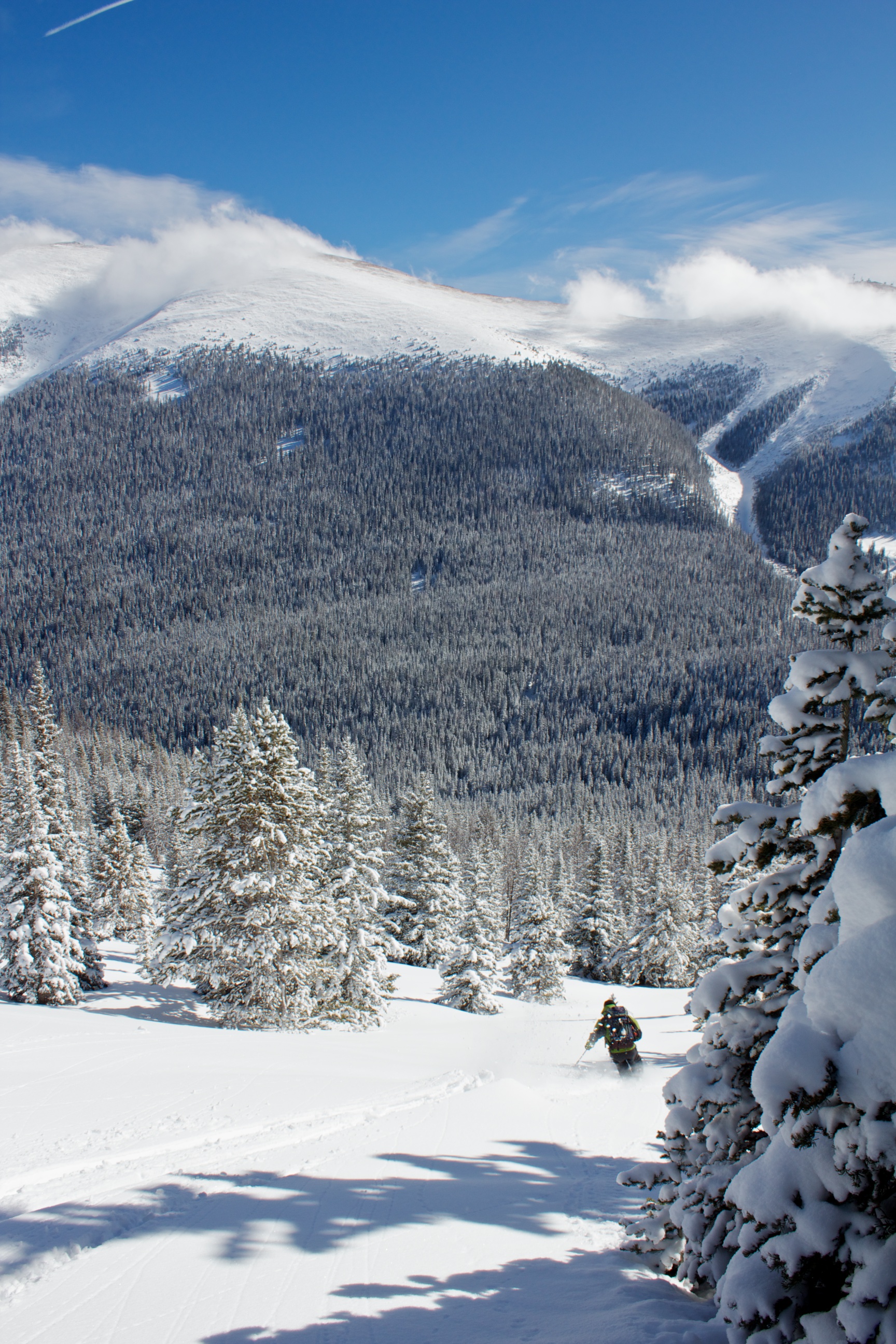 After storming hard all night, the clouds scattered and left a high dusting of awesome light snow on Berthoud Pass. I, along with thousands of other people, rushed back to the mountains and shredded the beginnings of a real Rocky Mountain winter. Coverage was still thin in spots, but my guides (Joe, Adam and Shukah) led the way to some beautiful meadow lines and some tight and fast tree pow.