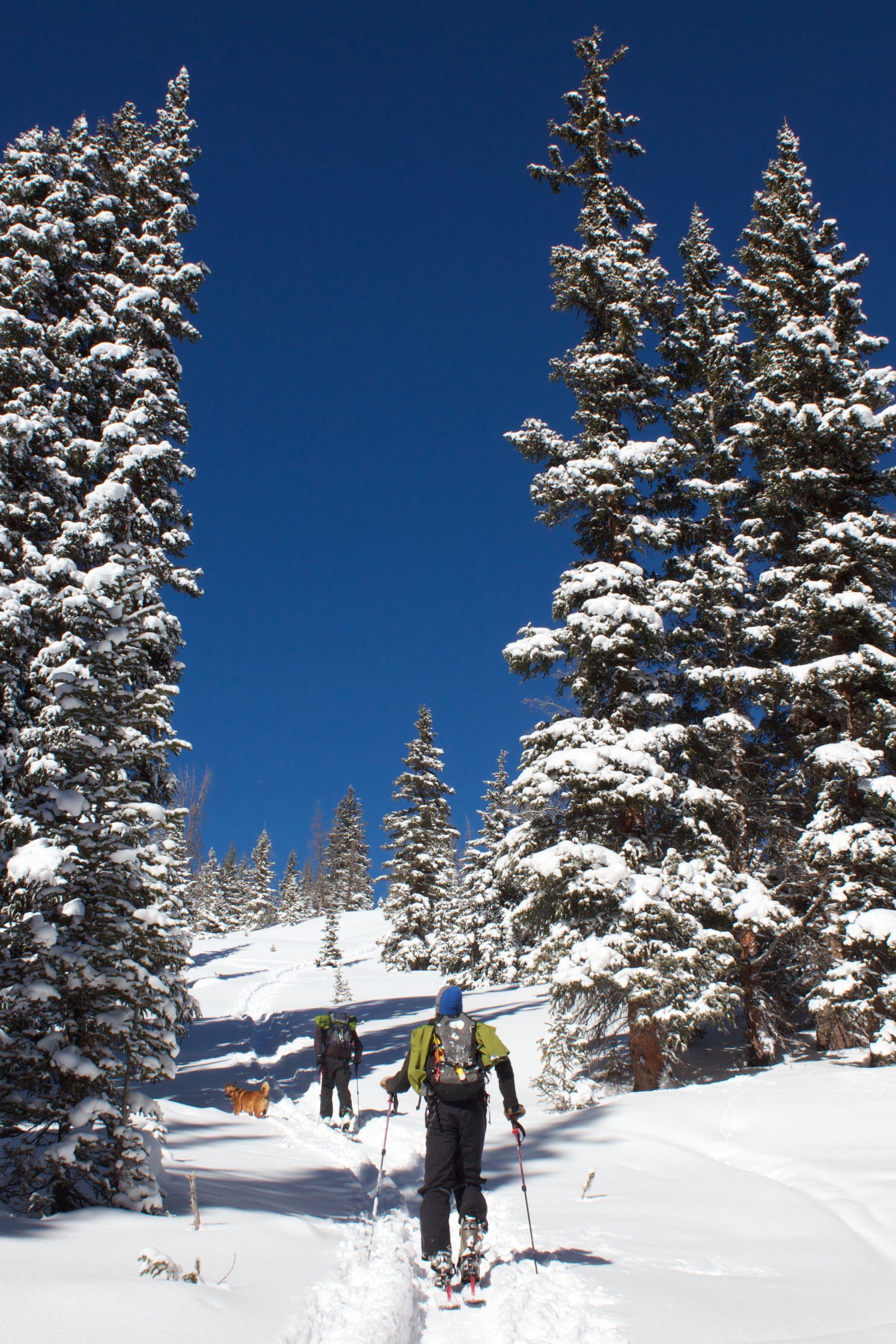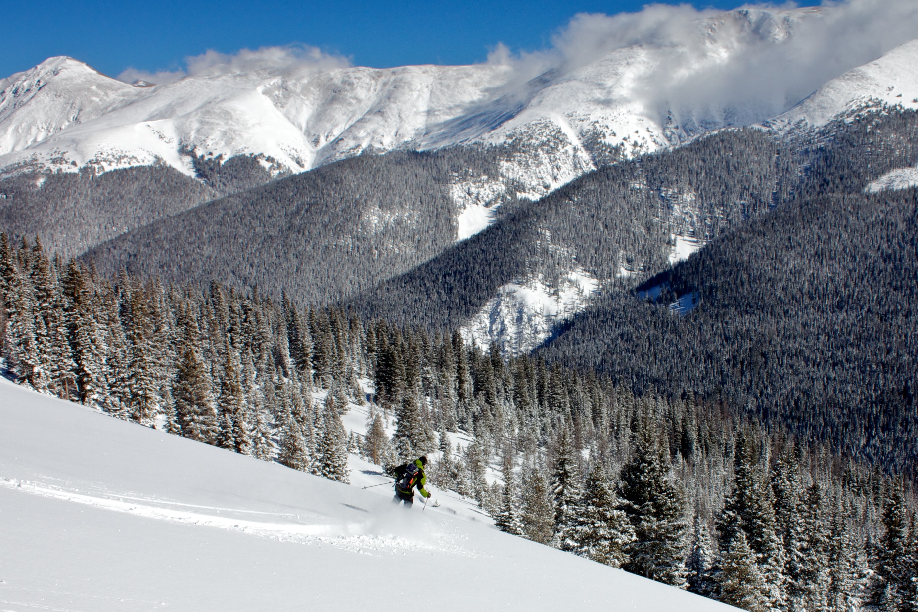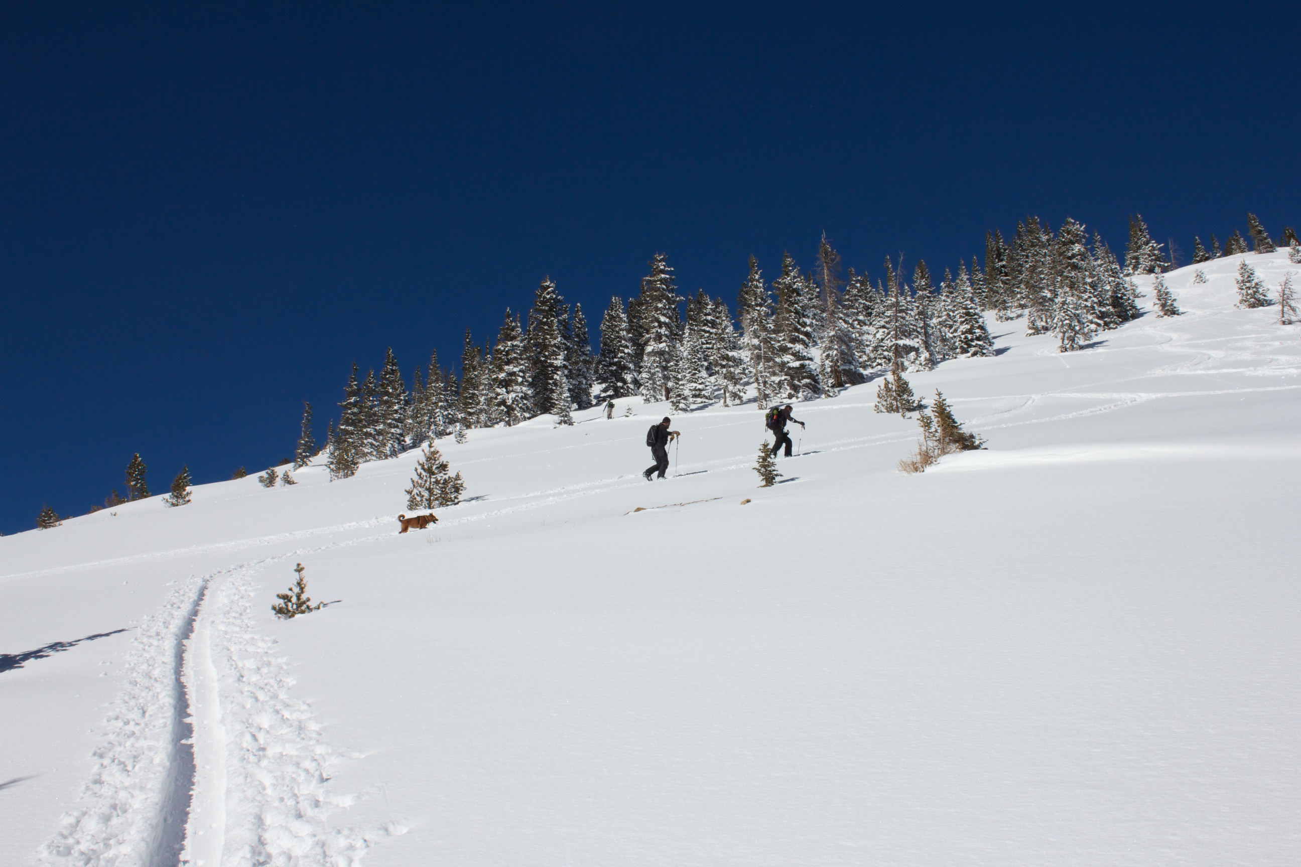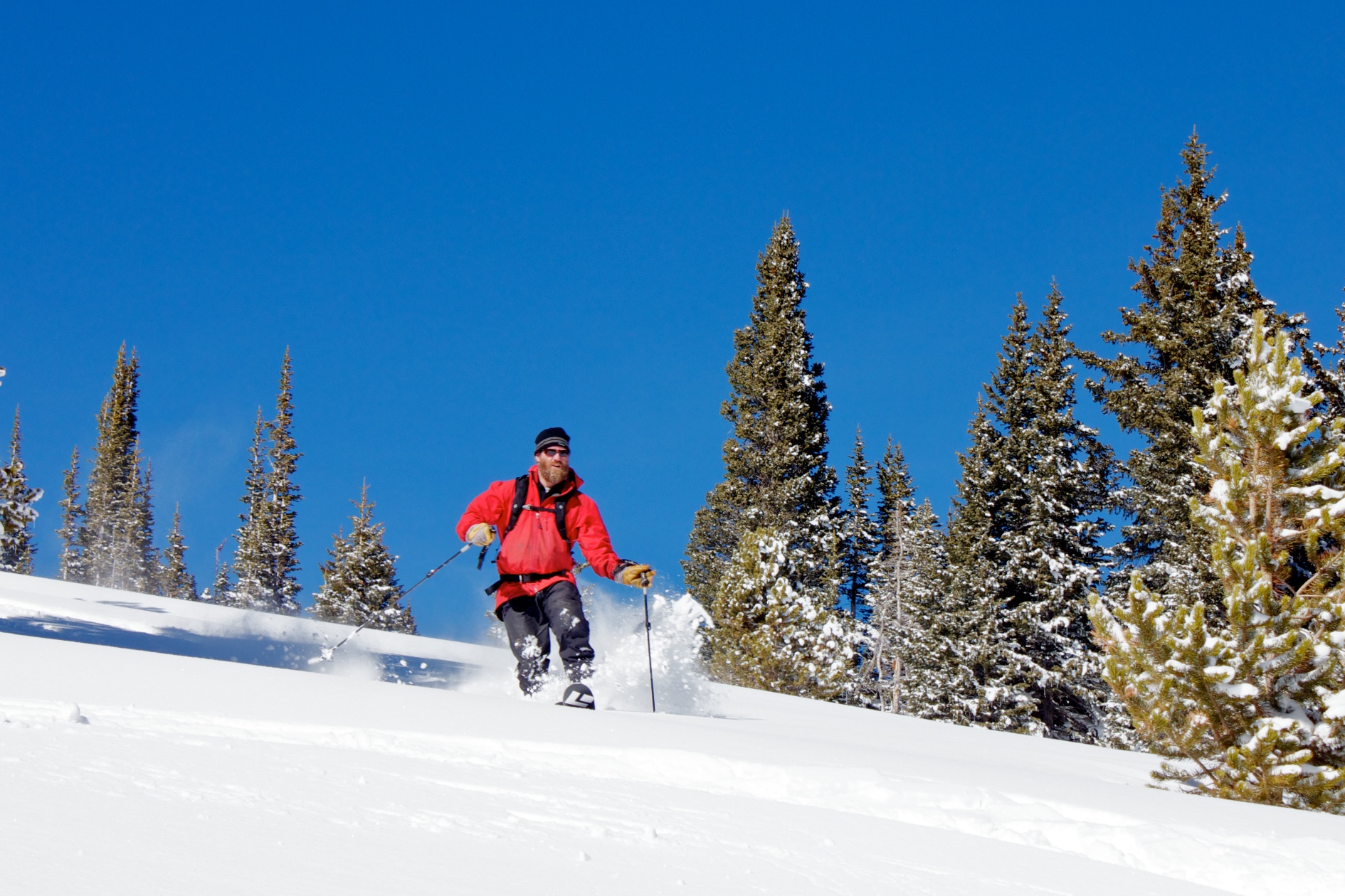 After storming hard all night, the clouds scattered and left a high dusting of awesome light snow on Berthoud Pass. I, along with thousands of other people, rushed back to the mountains and shredded the beginnings of a real Rocky Mountain winter. Coverage was still thin in spots, but my guides (Joe, Adam and Shukah) led the way to some beautiful meadow lines and some tight and fast tree pow.