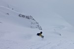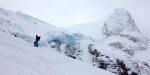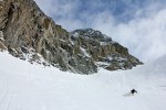 On a much better uptrack we hit the top lake a full 45 mins faster than the previous day, and scoped lines already skied off the top of Slalok! Some eager Dawn-Patrollers had Slayed the west side of the main face and left us the perfect fall-line descent directly above the lake (you can see it in the photo above – far right side, next to the Slalok buttress.) With a skin track set right to the top of our prospective run, we raced up the moraine slope onto the Matier Icefield with the occasional blast of April sun sloughing snow off the cliffs above.