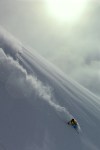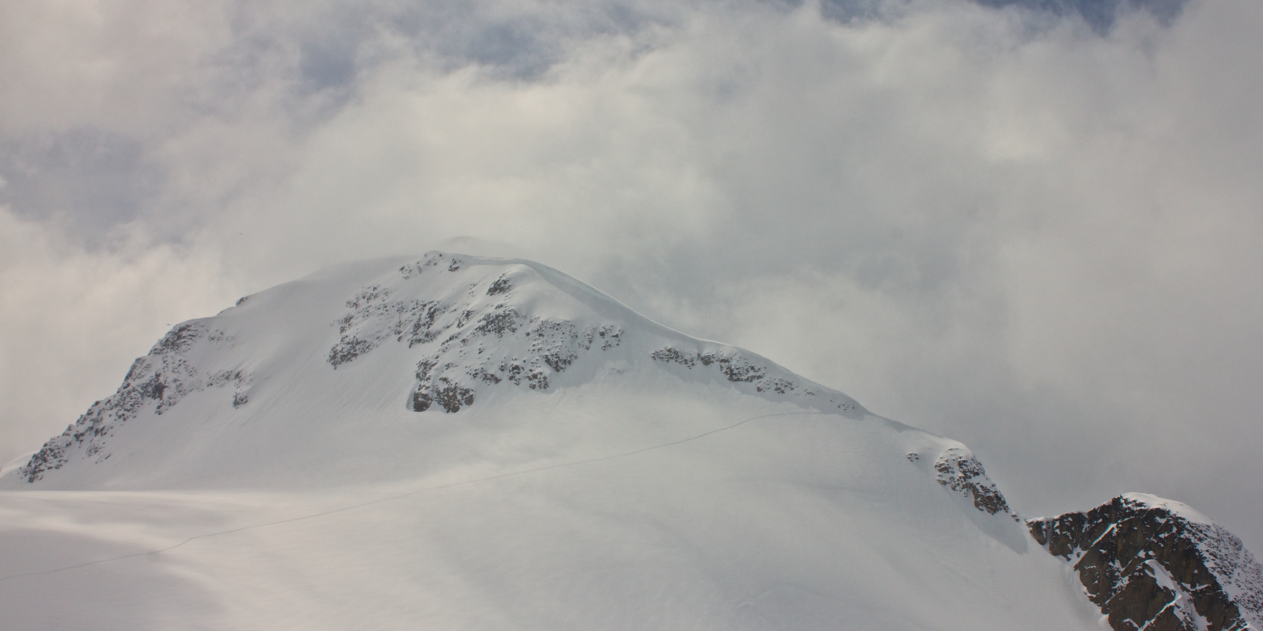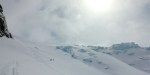 The final approach to Slalok is relatively easy, but the clouds were swirling and we had less than 10% visibility. Once on the ridge, we transitioned and waited for the inevitable break in weather that would light our way down the steep rollovers and (hopefully) between the gaping ice holes.