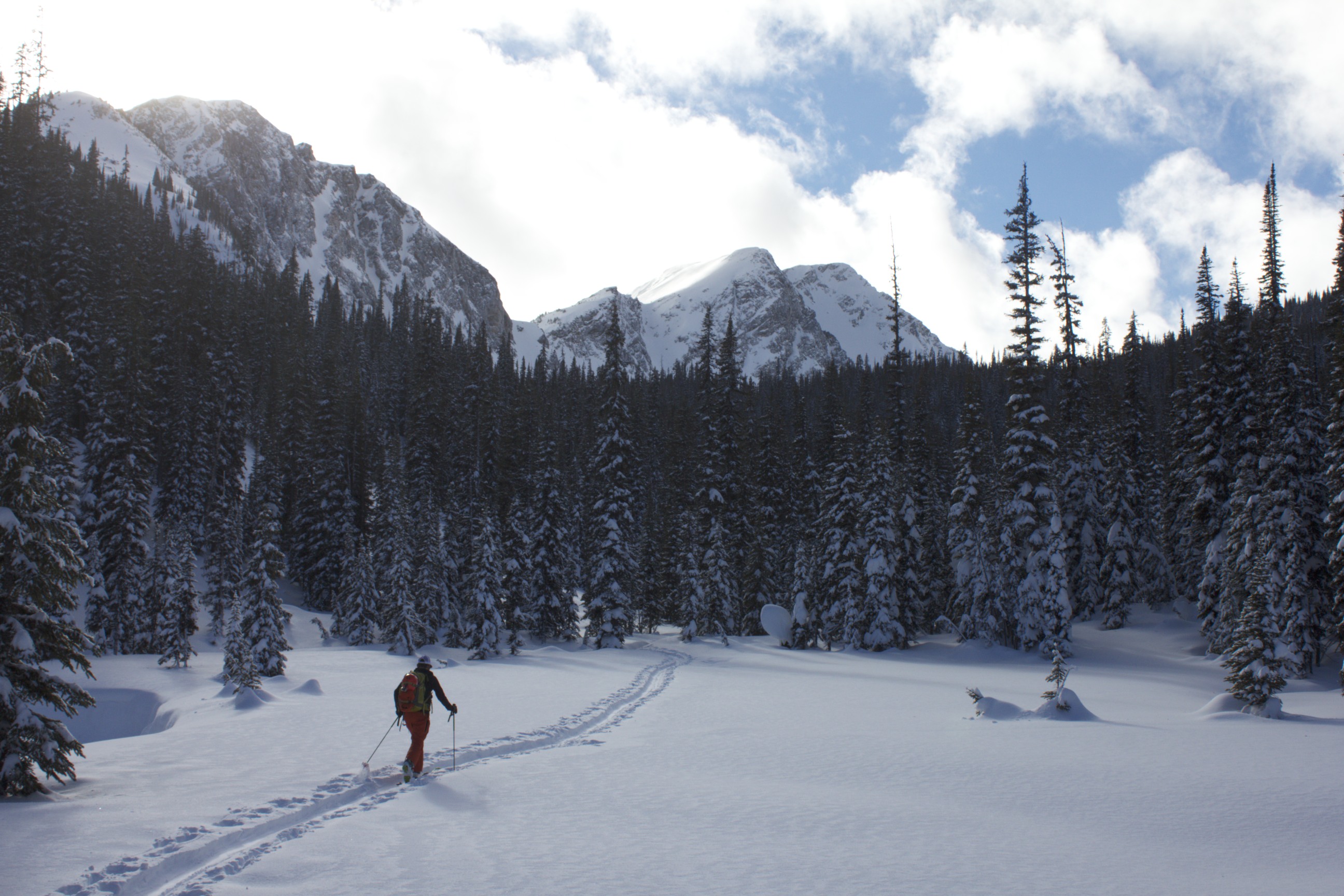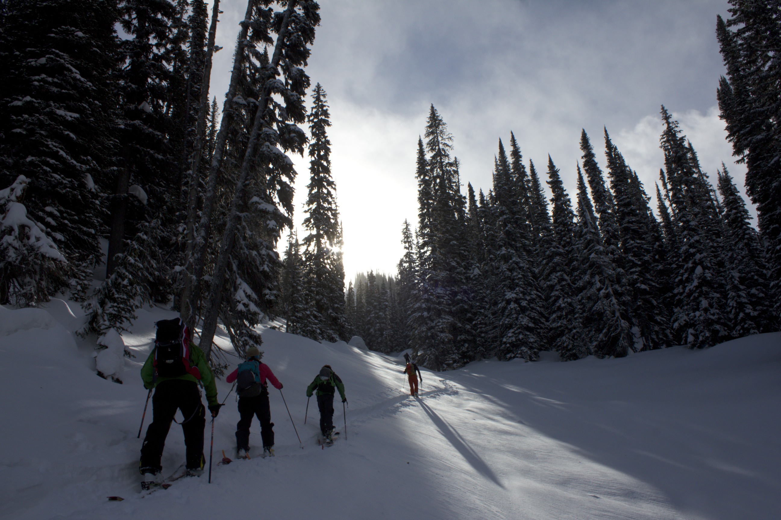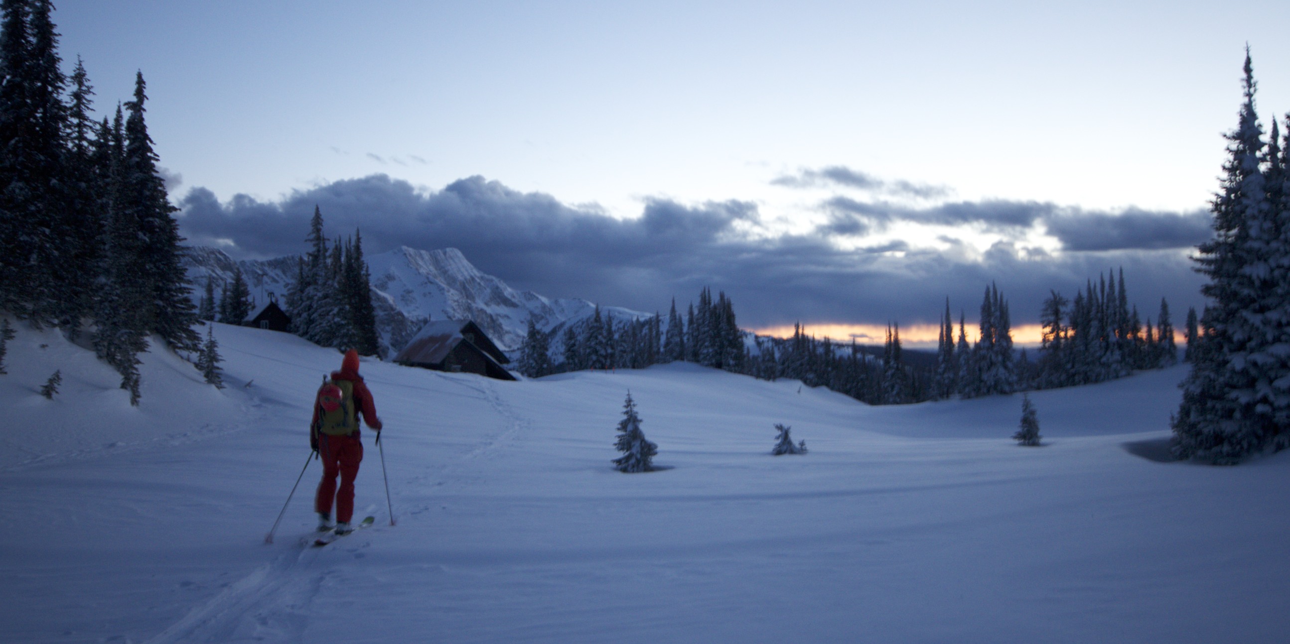 The beginning of our week was the tail end of the widespread pow-depression that afflicted much of BC in early 2014 and allowed incredible vistas and reconnaissance of the surrounding peaks. The Trophy Mountain complex is tucked away to the North and Raft looming in your face from nearly every window in the hut just to the South. The hut itself is setup with propane heaters, stove, oven, lights and, more importantly, sauna, and comes with all kinds of luxurious hut accessories like blankets, sleeping mats and crocs/boots. Leaving the trailhead, I heaved a huge pack onto my back, briefly cursed the 18 beer and bottle of Auchentoshan I packed earlier in the day, and started climbing the last 2 km up to the Chalet. After a long drive, a slow -20 deg start, some hassles with the 50+ year old Sno-Cat, and a gruelling 1.5 hour climb to the chalet, we made it up just in time for some refreshing beverages and a final push up Cabin Hill to take in the first of many epic alpine sunsets.