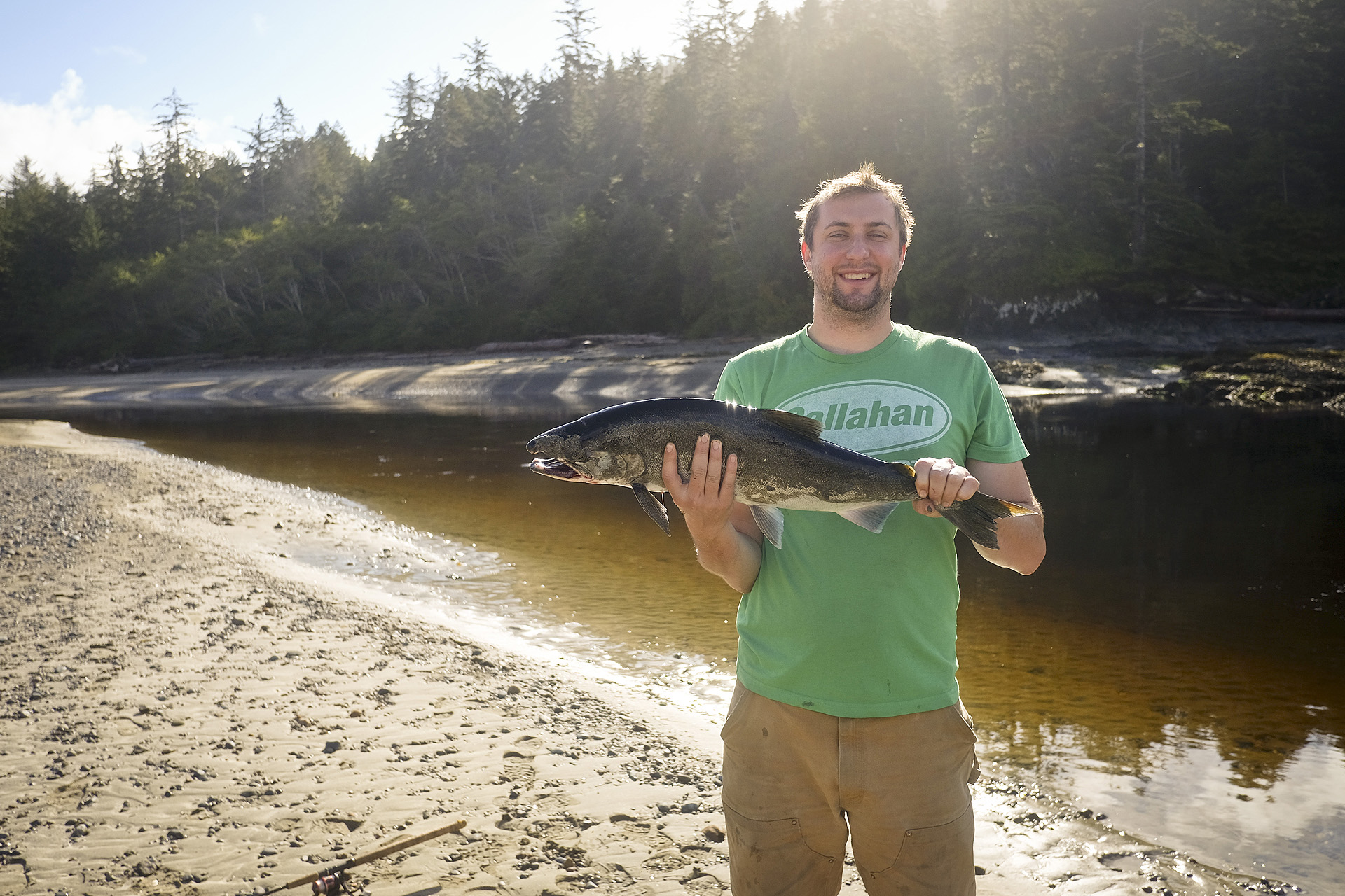 The camp is ideally situated in a peninsula of forest, sandwiched between the wild Pacific Ocean and a tidal estuary. Being late September, our camp was constantly inundated by the sounds of surf crashing on the beach, crackling wood in the campfire and wild Pacific coho dancing and slapping tails in the river. With no chance of contact to the outside world we settled into a natural rhythm with our surroundings and the movement of the tides. Flooding low tide turned out to the most active time for fishing, and several hooks were sunk into delicious fish that filled out our meals… BBQ salmon, salmon pasta, even a backcountry soup (and I’m not talking about the hottub). Being right at the mouth of the river, the salmon are bright and shiney chromers with plenty of dance and acrobatics skills to show off – which made landing one on the fly even more delicious.
