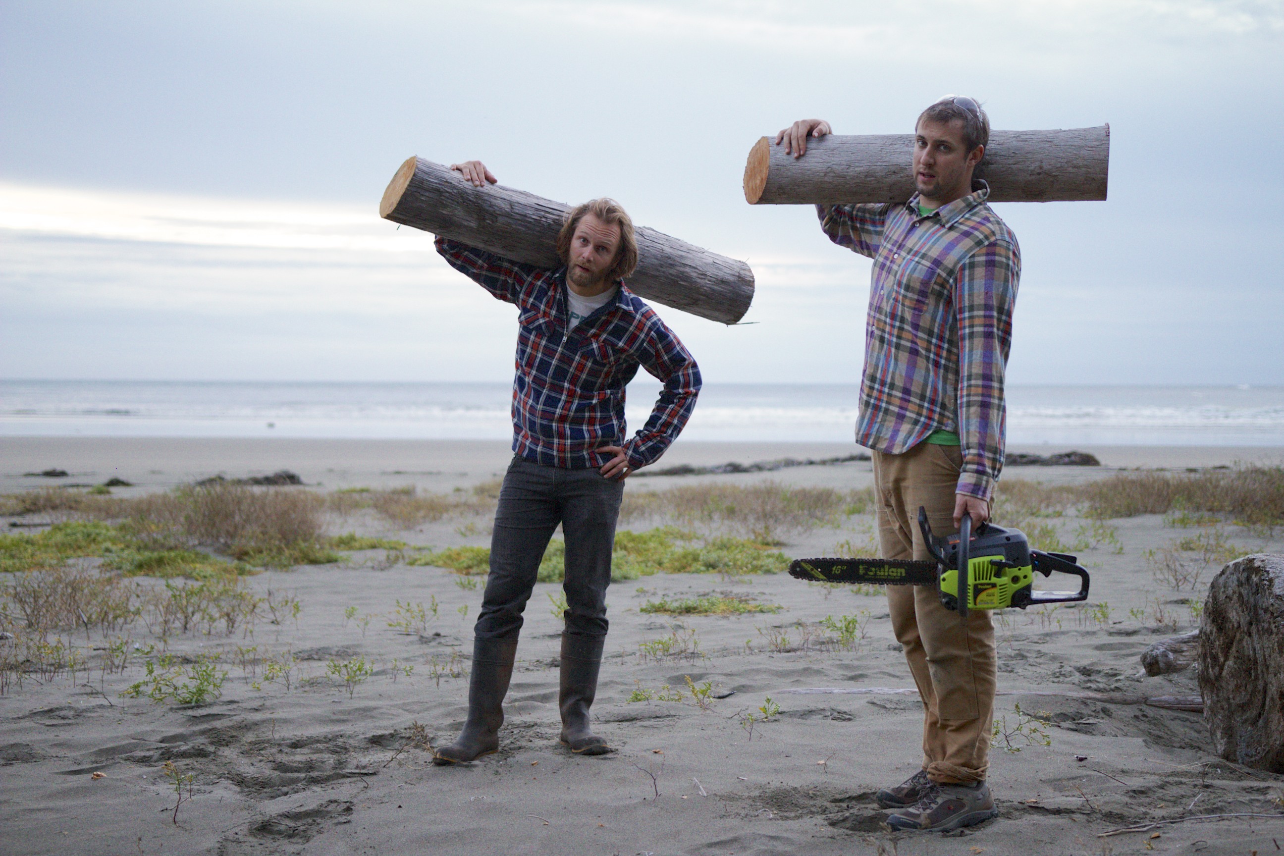 After hiking, the next variety of survival skill required is the procurment of firewood. While one would expect a remote north-coast beach to be awash with ample driftwood to keep us warm and dry, and with the addition of a chainsaw that assessment is correct. But when the saw runs out of oil and you’re left with a large-ish hatchet plus some bowsaws, firewood harvesting becomes much more labourious and energy-intensive. Selectivity increases and before we knew what was happening, Tim had us hauling bags of prime high and dry driftwood over a kilometer down the beach. Again laborious, but completely worth it when the sun sets and the dark damp cold rolls in.