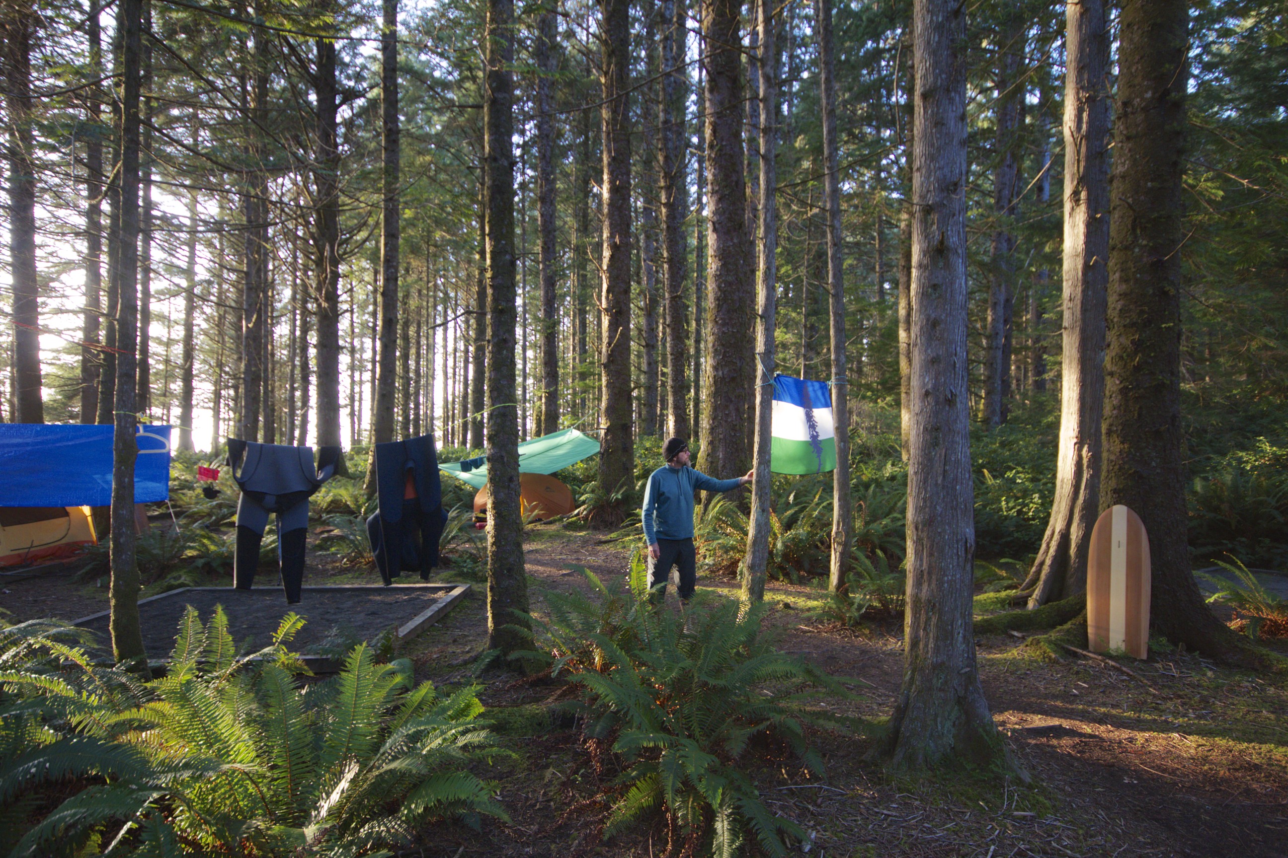 Northern Vancouver Island is a wild and remote place, defined by massive trees, spiderwebs of logging roads, howling winds and a regularly angry ocean. The adventure call was placed at the end of summer and a mighty crew was assembled from across the land to engage in a pitched battle (tent-pun intended) against these elements. The weapons of choice were tarps, tents, food, booze, fishing gear and surf gear (including an arsenal of Paipo’s and an Alaia coutesey of Tim and the Radish Empire), which were collected, divided and humped along the gnarly wet coast trail down to the beach. Right off the bat, Filip and I managed to miss the early ferry by 30 seconds and thus ended up chasing the others north and reaching the beach just after dark to find a fierce headwind whipping along the beach. We decided to ditch the board bags (aka – sails) in some foliage and come back for them in the daylight, as an hour walking down the beach in the dark holding onto board bags for dear life is not how we inteded to start the trip.